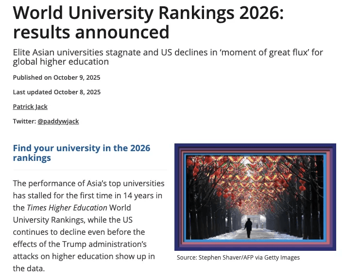 多家国际媒体对THE榜单进行了同步解读。NDTV指出,印度高校整体表现持平,仍未进入世界前200强;而**《卫报》**则重点报道澳大利亚大学的逆势上扬——墨尔本大学成为该国历史上排名最高的一次,进入世界前20。