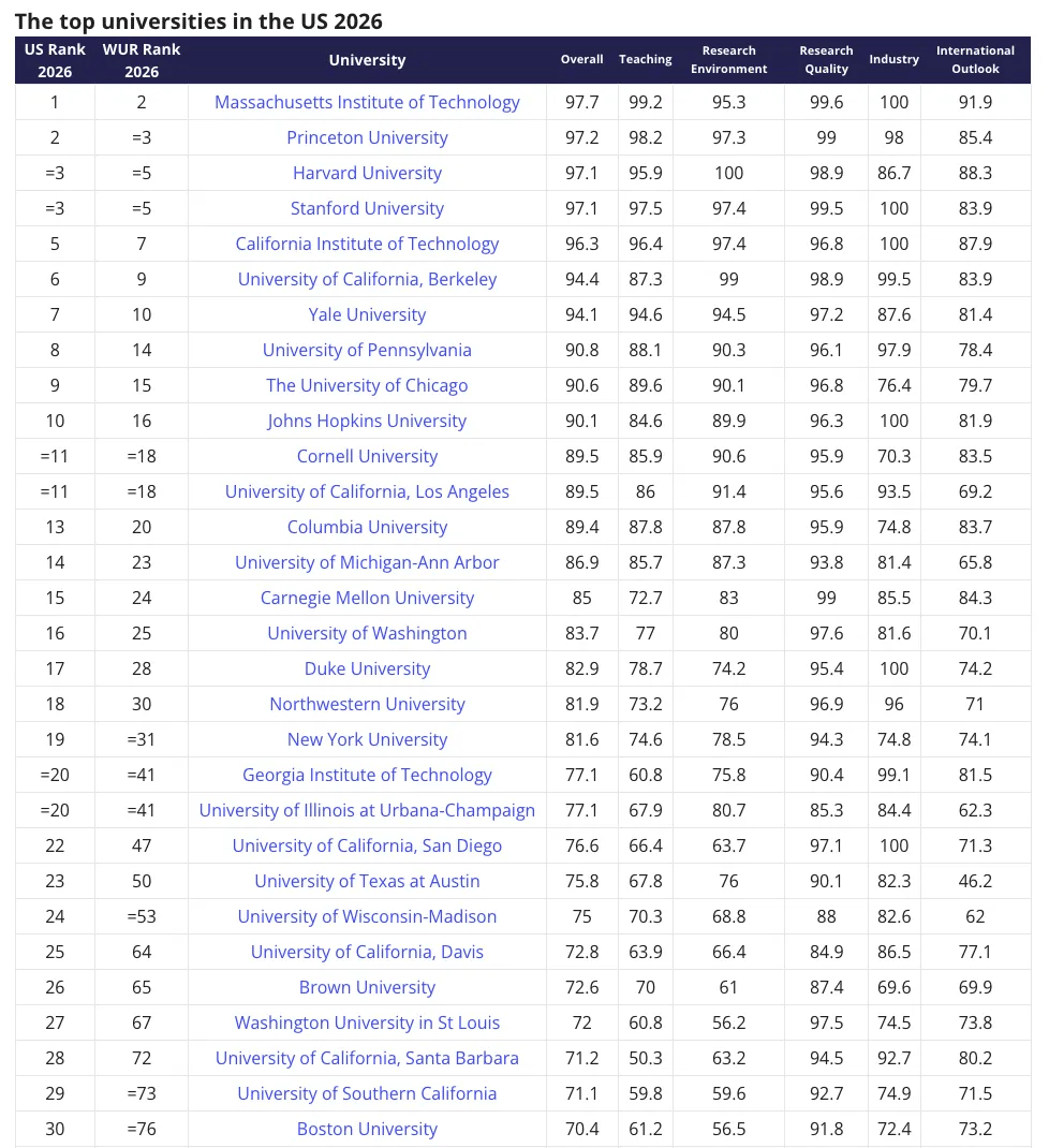 与全球榜单同步,THE面向学生推出的《2026美国最佳大学排行榜》也于今日上线。榜单侧重教学体验、就业支持、校园安全与师生互动等指标。结果显示,麻省理工学院(MIT)取代哈佛登顶,普林斯顿位列第三。