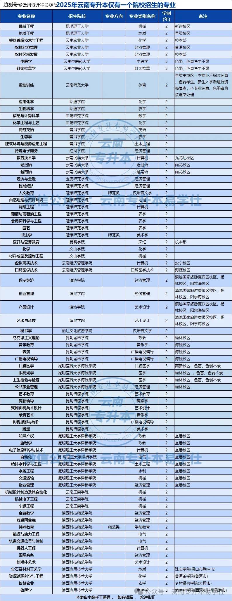 2025年云南专升本招生院校共有30所院校,43个专业大类,169个专业招生。今天给大家整理了2025年只有一所院校招生的专业。