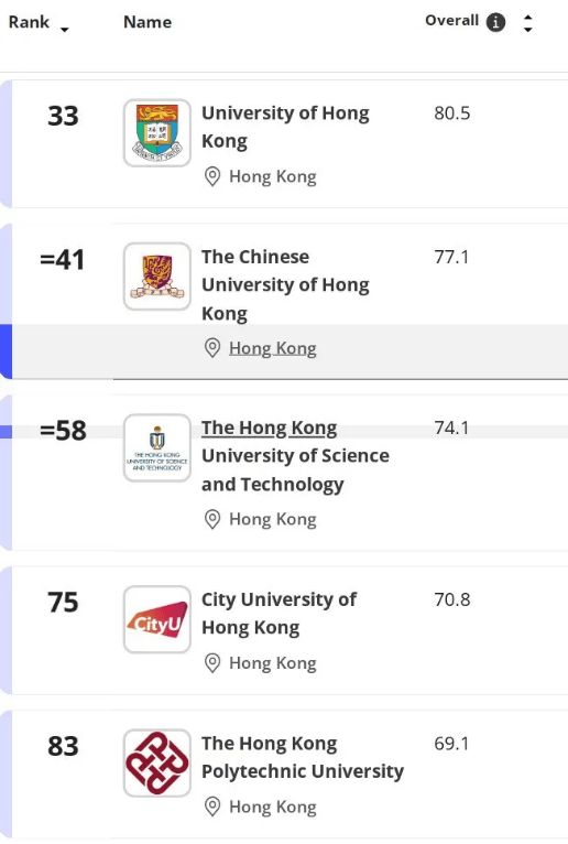 其余所高校的排名跃升,更具含金量。如,香港大学稳居香港院校之首,位列全球第33位,较去年上升2位;香港中文大学位列第41名,较去年上升3位;香港科技大学上升8位至第58名;香港城市大学和香港理工大学分别位列第75位和第83位。