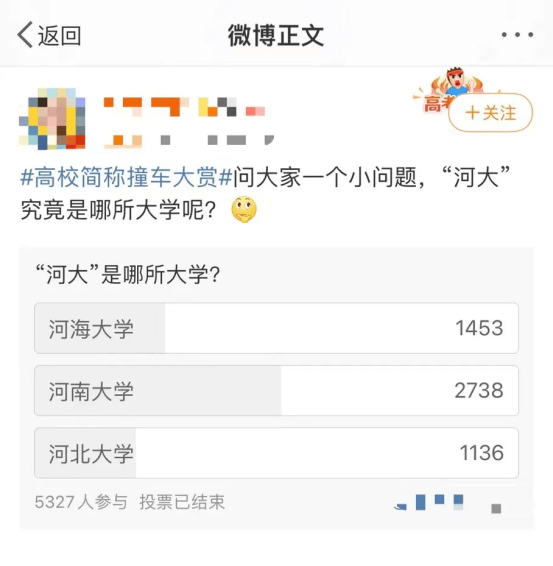 为了从“撞名修罗场”里杀出重围,一些高校在简称上选择另辟蹊径。微博上曾有过一个关于“河大究竟是哪所大学”的投票,评论区众说纷纭。一片混战之中,河海大学学子淡定现身:“勿cue,我们可不是‘河大’,是‘河海’!”