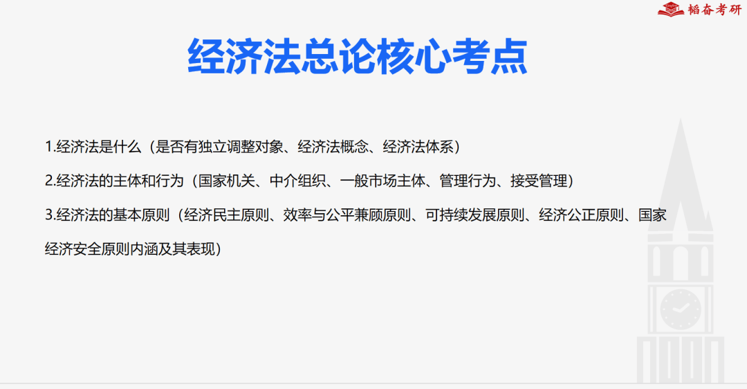 本次课程讲述了法综经济法课程的内容。首先,学姐根据近年法综经济法真题,总结了经济法部分命题特点、规律,针对今年法综部分经济法新增内容进行了介绍。学姐在课件中罗列出了法综经济法部分较为重要的考点,5节课的时间,学姐针对法综经济法总论、宏观调控法律制度、市场规制法律制度、市场监管法律制度、商法总论的重点内容进行了梳理讲解。在讲解知识点的过程中,学姐结合热点案例进行分析拓展,为同学们后期的复习背诵提供了方向。