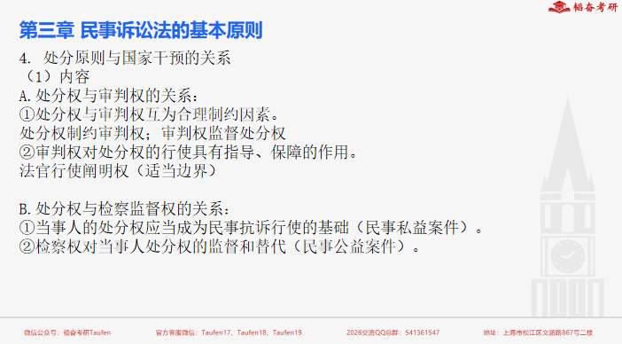 本次民事诉讼法国庆班授课共24个课时,课程目标为带领回顾所有重点考点,了解不同知识点的对应考察题型,以帮助考生在后期备考期间掌握重点,并有针对性地拓展热点内容。就各章讲解而言,讲师通过结合思维导图点明,帮助学生快速把握学习重点。比如第三章民诉基本原则部分,在对当事人权利平等原则、辩论原则、处分原则、诚信原则、直接言辞原则等基本内容进行回顾的基础上,结合域外辩论主义、处分权主义进行讲解,并拓展了我国现行民诉制度的不足与亟待完善之处。同时,讲师对诉讼标的理论、判决效力等内容进行了必要的理论补充,并明确说明了考生在掌握不同知识点时需要达到的准备深度。除此之外,就此次新修订的民事诉讼法中的重大变化以及检察公益诉讼、在线诉讼等内容,均结合可考性进行了多次强调与必要拓展,以帮助大家应对热点关键。
