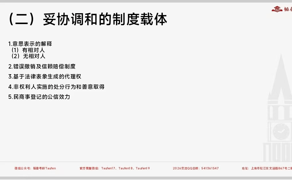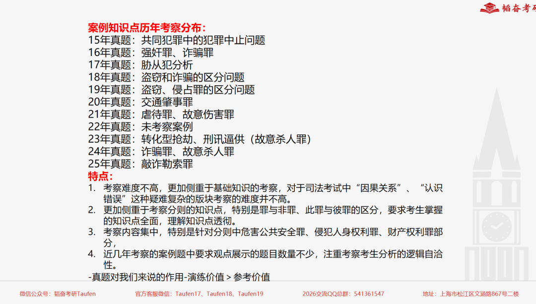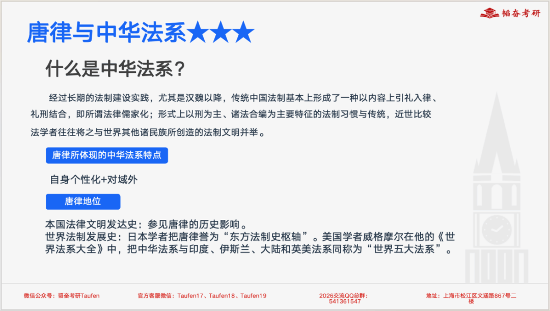 本次课程总时长是4个课时的内容,主要是对法律史规定的考试范围的知识点进行了讲解与回顾。课程分为五个部分的内容:法史背诵建议、重难点内容讲解、强化阶段背诵串联与攻克、答题思路和技巧总结以及热点及考点预测。考纲在9月30日公布,法综法史考察内容相较于去年并未变化,学姐据此进行全面细致地梳理知识点。本次国庆班强化阶段旨在对于重难点知识点的讲解、体系化构建以及知识点的出题形式和答题思路的分析,在立足真题、教材、资料以及法史事件的基础之上,做出考点预测,帮助考生更好地备考和冲刺。