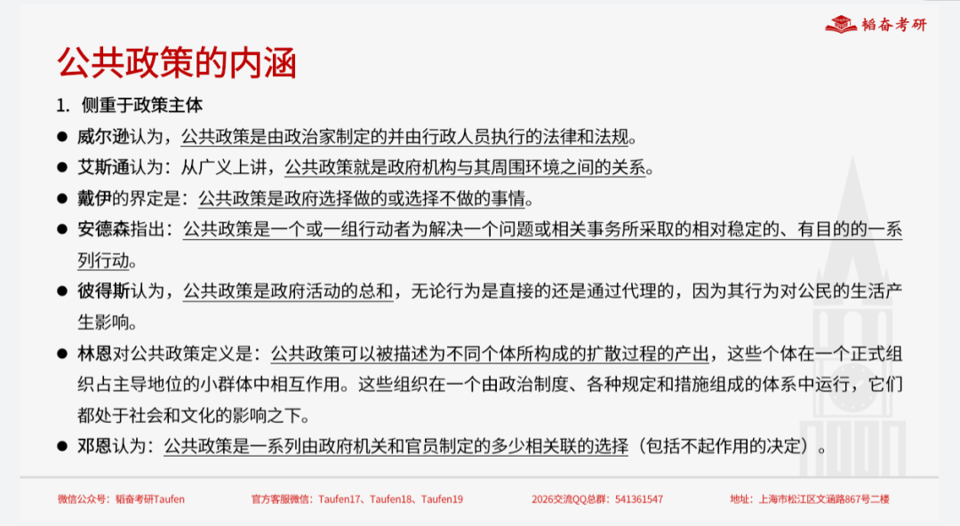 本次课程共20学时,依据2026年《公共政策学》考试大纲系统讲授核心内容。第一部分聚焦教材第1—9章(导论、公共政策、政策系统、政策问题与议程、政策制定、政策执行、政策评估、政策创新与扩散、政策终结与变迁),精讲高频考点,帮助考生压缩记忆范围、把握知识主干。第二部分选取教育、环境等领域的最新政策热点,配套典型案例,示范如何运用理论框架解析时政材料并规范作答,实现“课本—热点—答题”三位一体的高效转化。