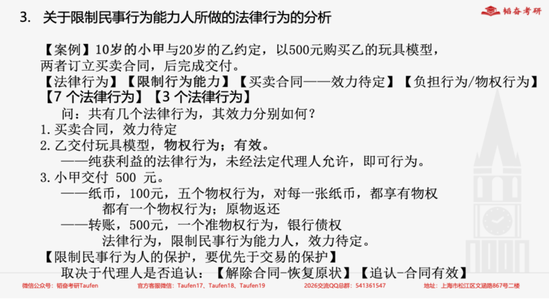 本课程结合了近年的命题规律,梳理了法综民法的知识体系,重点讲解了请求权基础方法、法律行为及代理部分,并着重分析了各部分的疑难问题,如无权处分、 限制行为能力人作出的法律行为等。最后,梳理了出题类型,总结了答题方法。