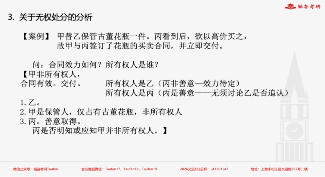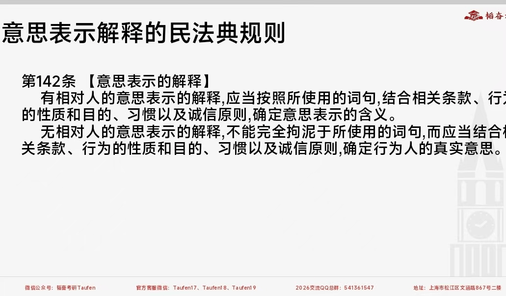 本次课程总时长是28个课时的内容,今天主讲10个课时,主要是对民法规定的考试范围民法总则,包括权利变动、法律行为等知识点进行了讲解。首先对权利变动的重点内容结合法条和案例进行阐述,着重强调案例的逻辑性和背诵要求,让同学们在复习的过程中要多多翻看法条,锻炼分析法条的能力。其次是法律行为,这部分包括法律行为与事实行为的区分、法律行为的区分原则。最后阐述了物权行为无因性案例的研究,从案型和法条的角度对此进行了强调。