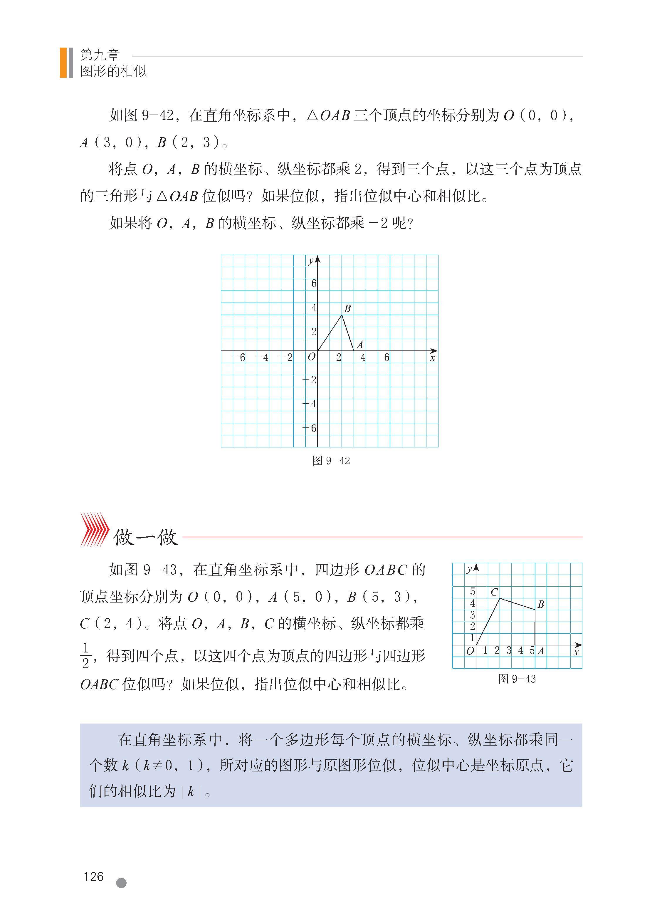 位似图形的坐标变化(如以原点为位似中心,相似比为 k,则点 (x,y) 变为 (kx,ky) 或 (-kx,-ky))。
