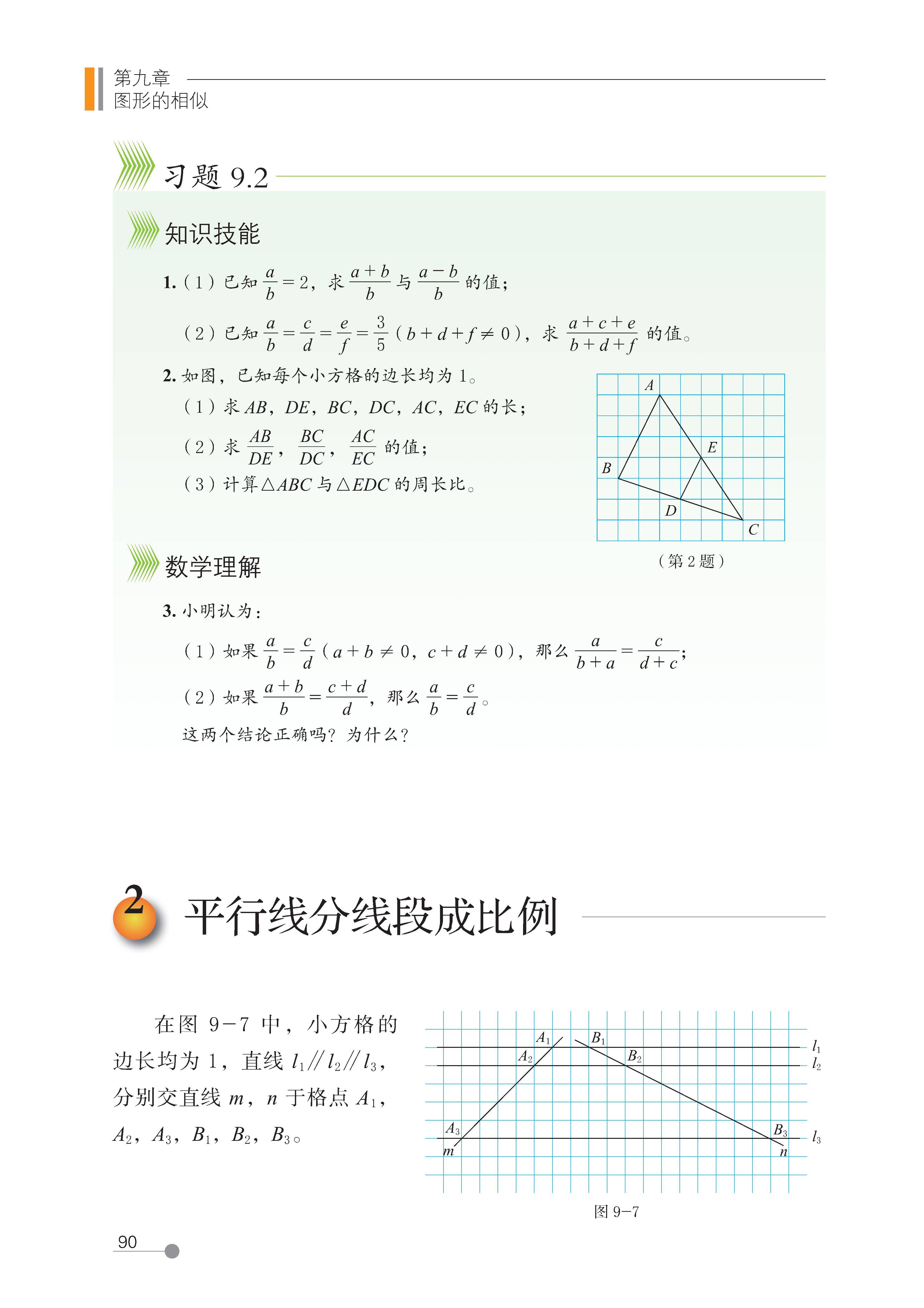第九章 图形的相似 成比例线段、相似多边形、相似三角形(判定 + 性质)、位似 1. 比例式的变形(合比、等比性质的应用);