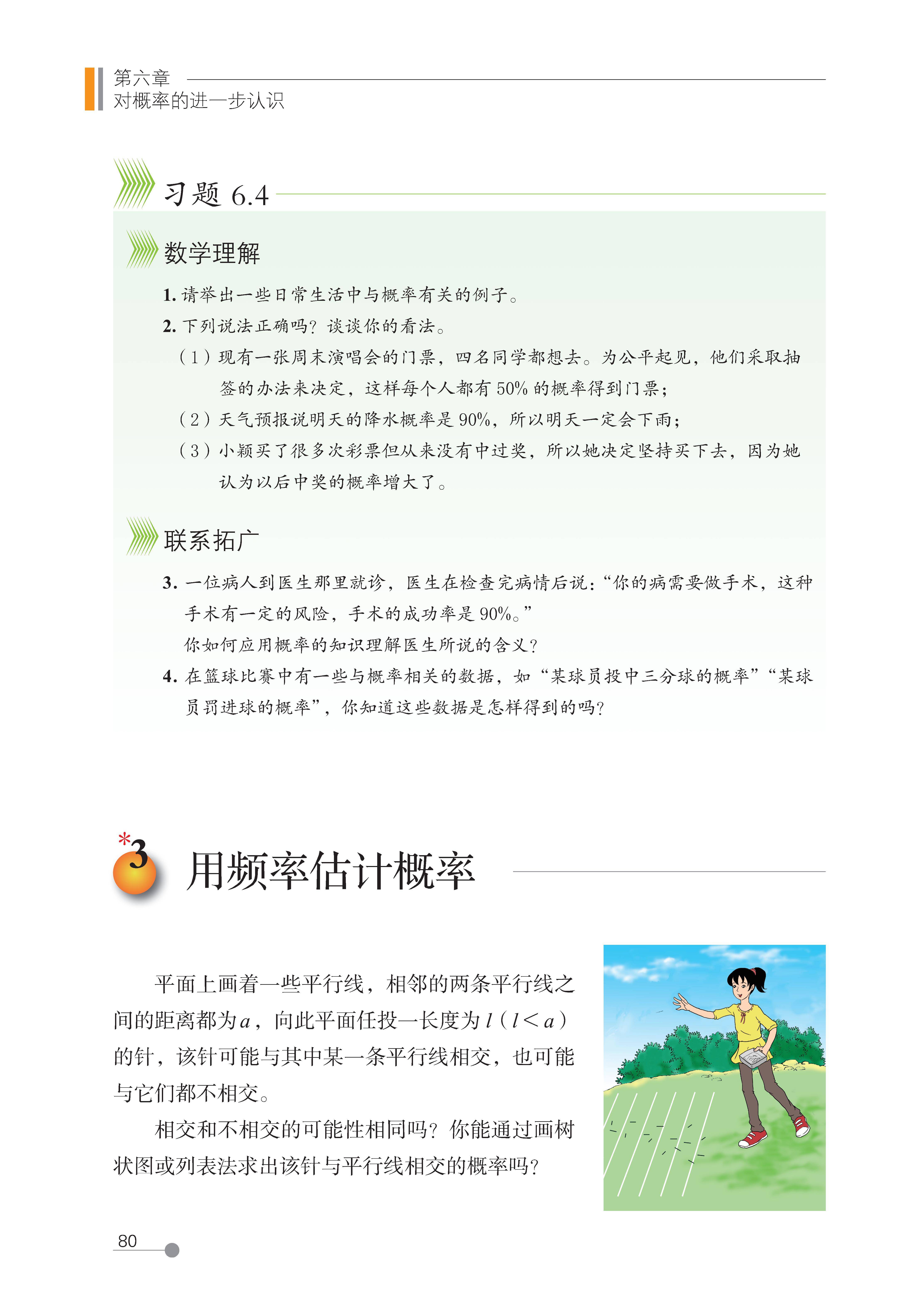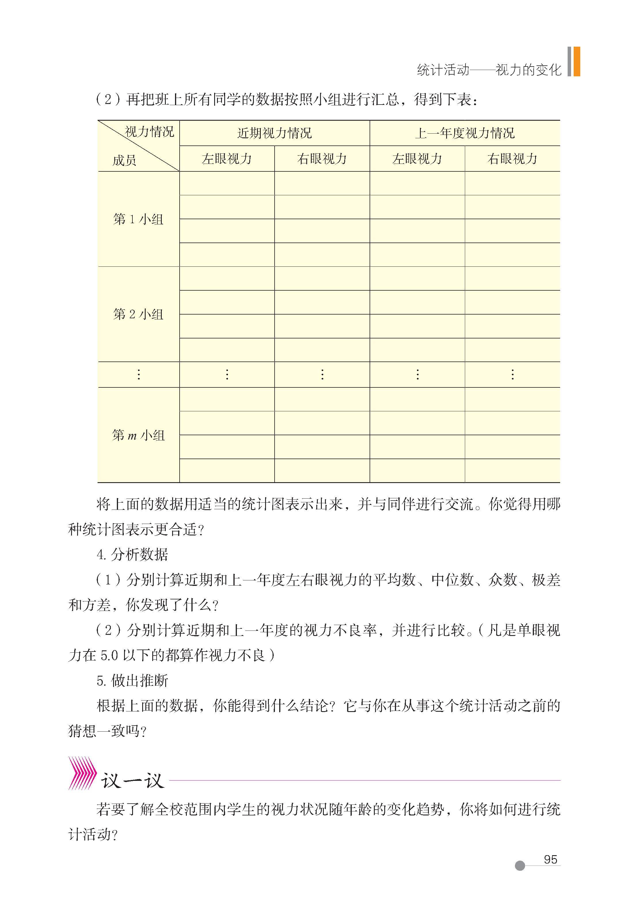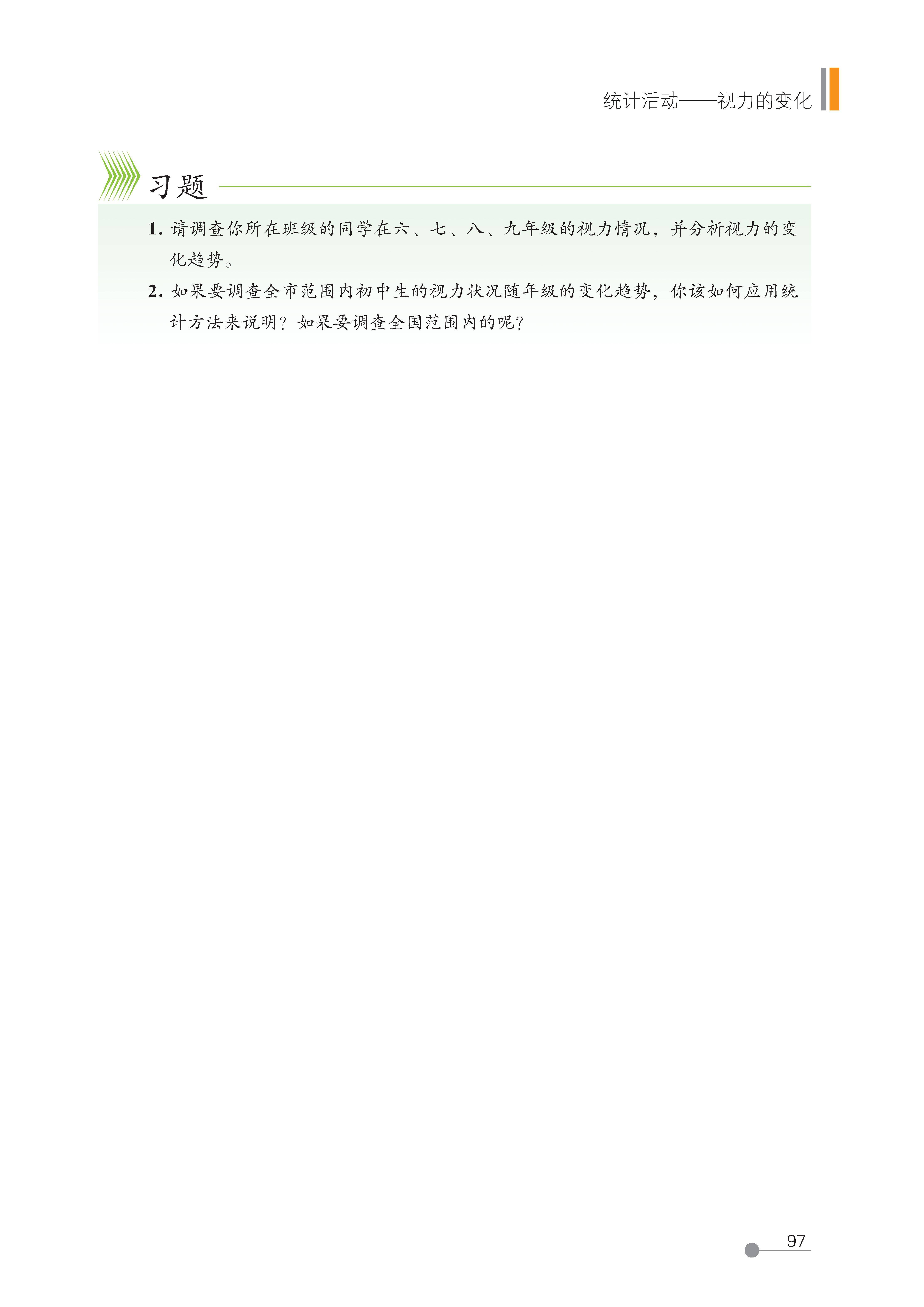 2. “统计活动 —— 视力的变化”:用统计知识解决 “现实问题”该主题要求学生完整经历 “统计探究流程”:设计调查问卷(如 “不同年级学生的用眼时间、视力数据”)→ 收集数据(班级 / 年级抽样)→ 整理数据(绘制条形图 / 折线图 / 扇形图)→ 分析数据(发现 “视力下降与用眼时间的关联”)→ 提出建议(如 “合理安排屏幕使用时间”)。教学意义:衔接八年级 “数据的分析”(平均数、中位数、统计图)和九年级 “用频率估计概率” 的知识,让学生体会 “统计不是简单的画图计算”,而是通过数据收集与分析,发现现实问题(如青少年视力下降趋势)、为解决问题提供依据(如向学校提出 “课间护眼建议”),培养 “数据观念” 和 “社会责任感”。
