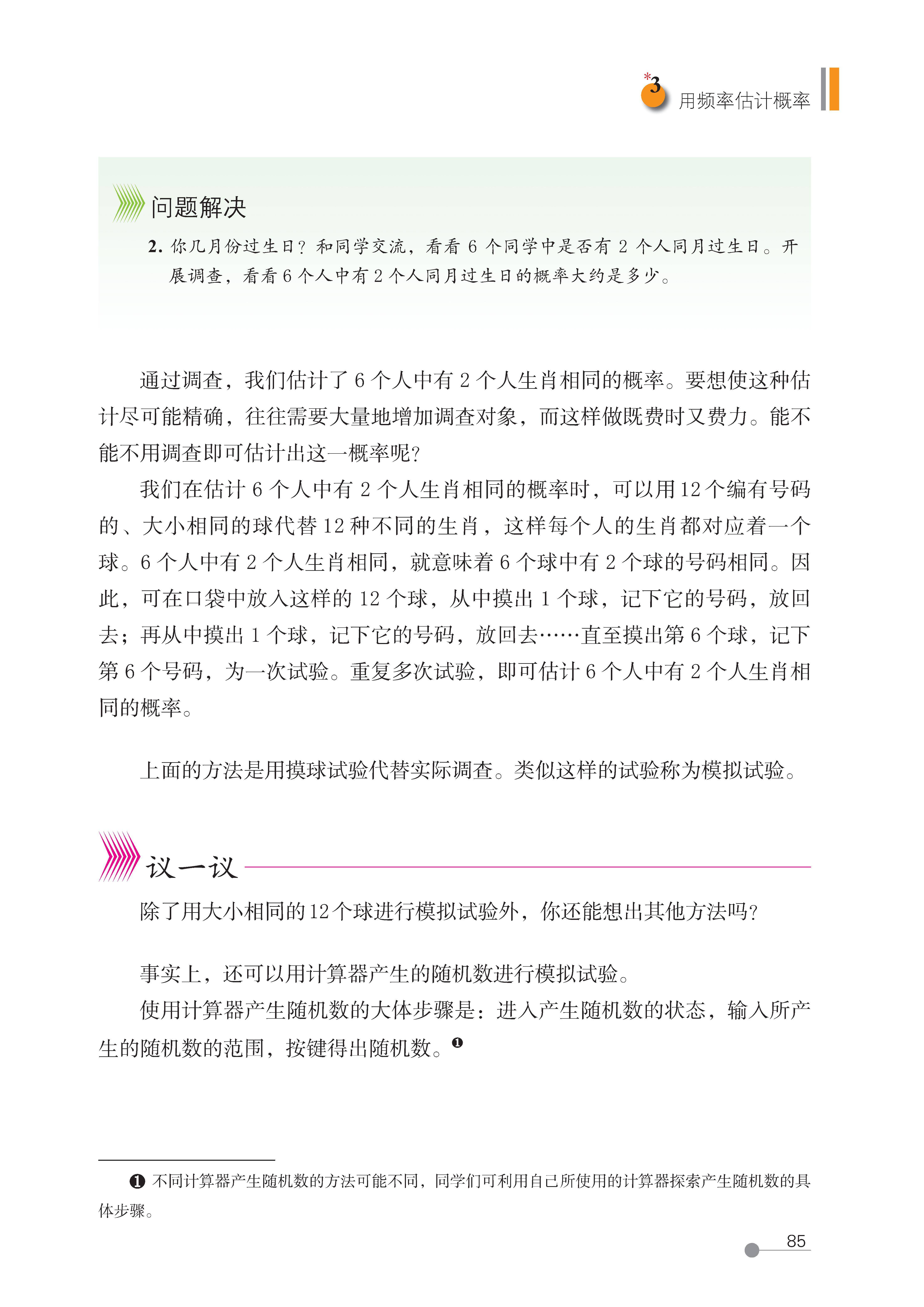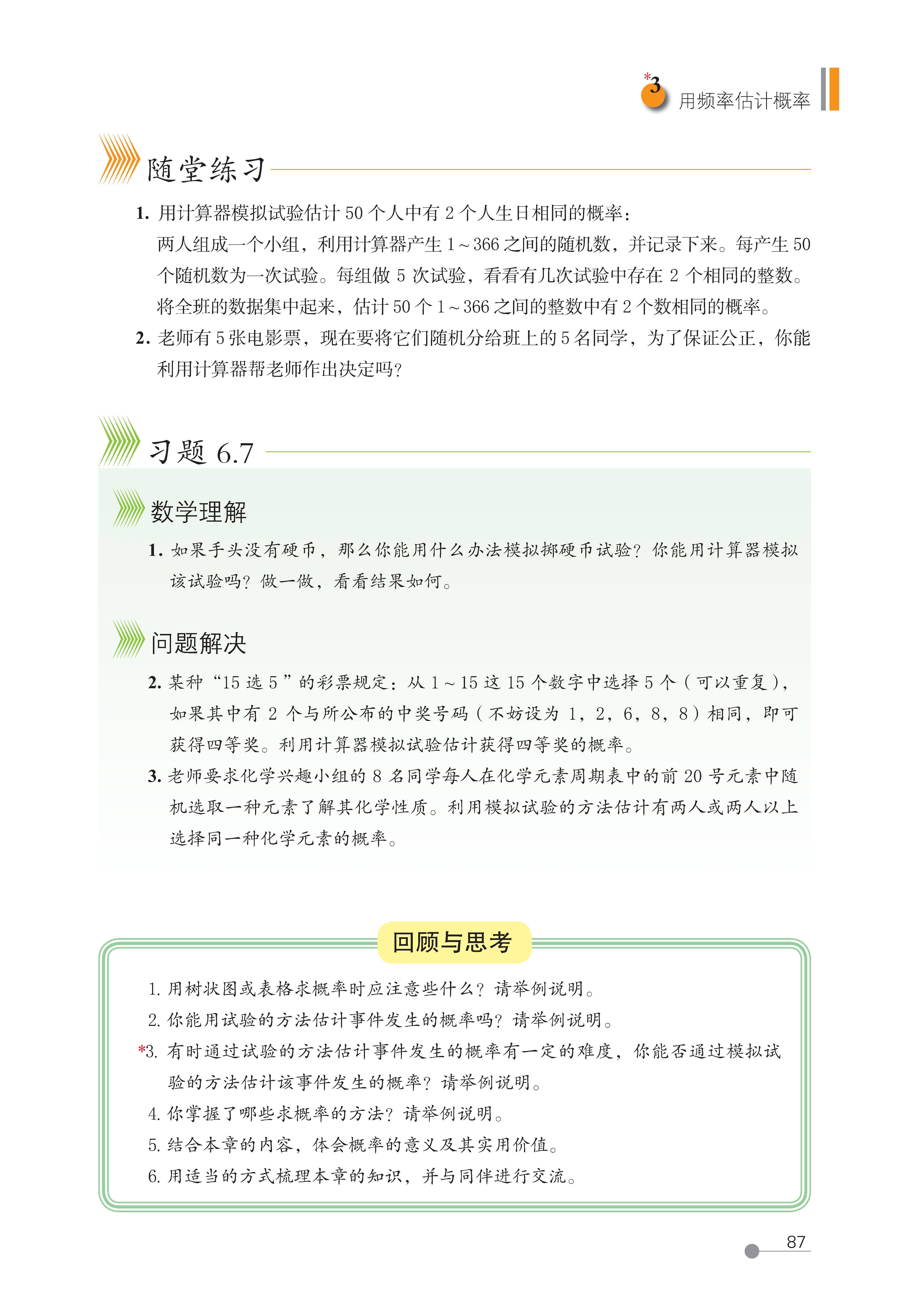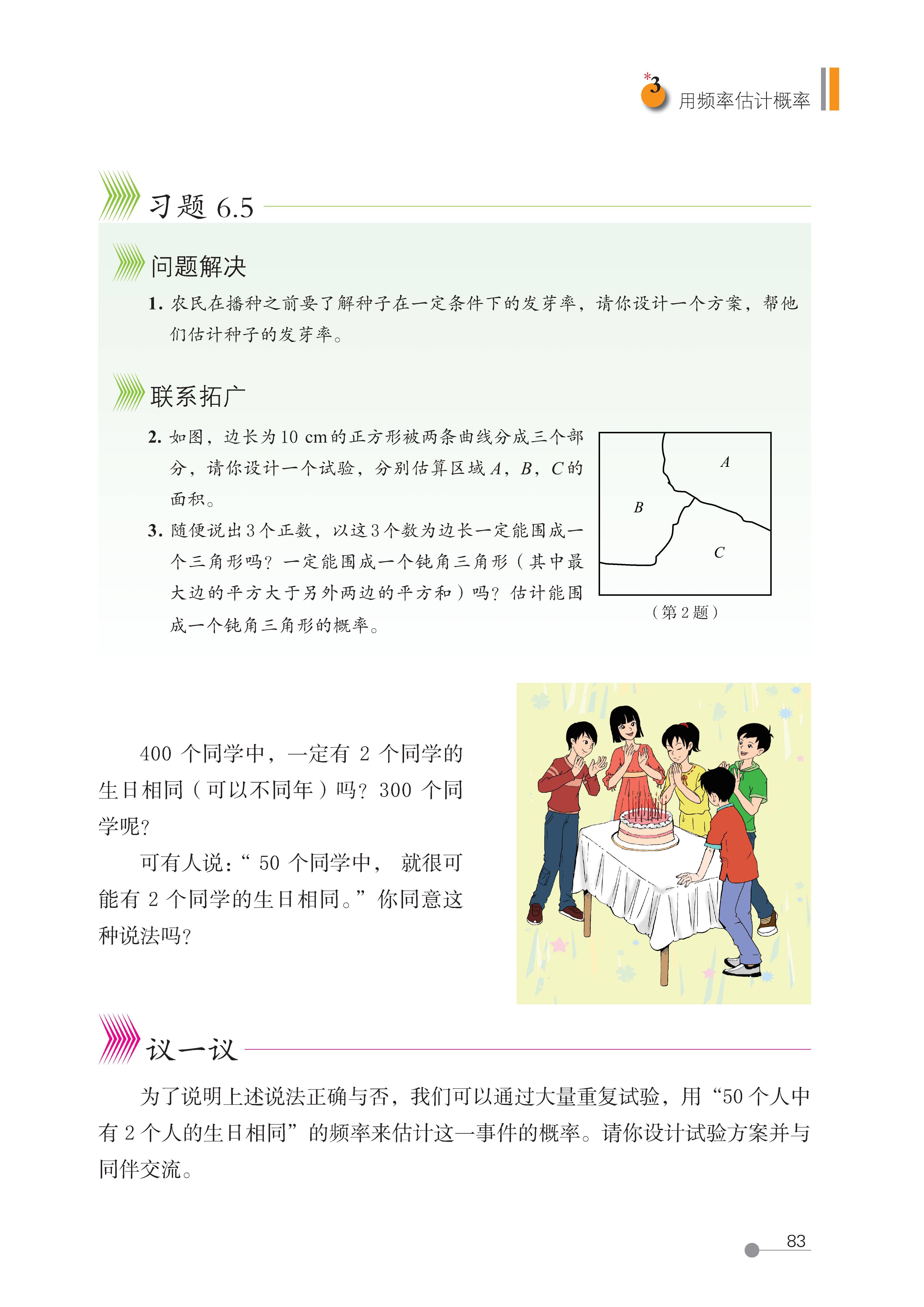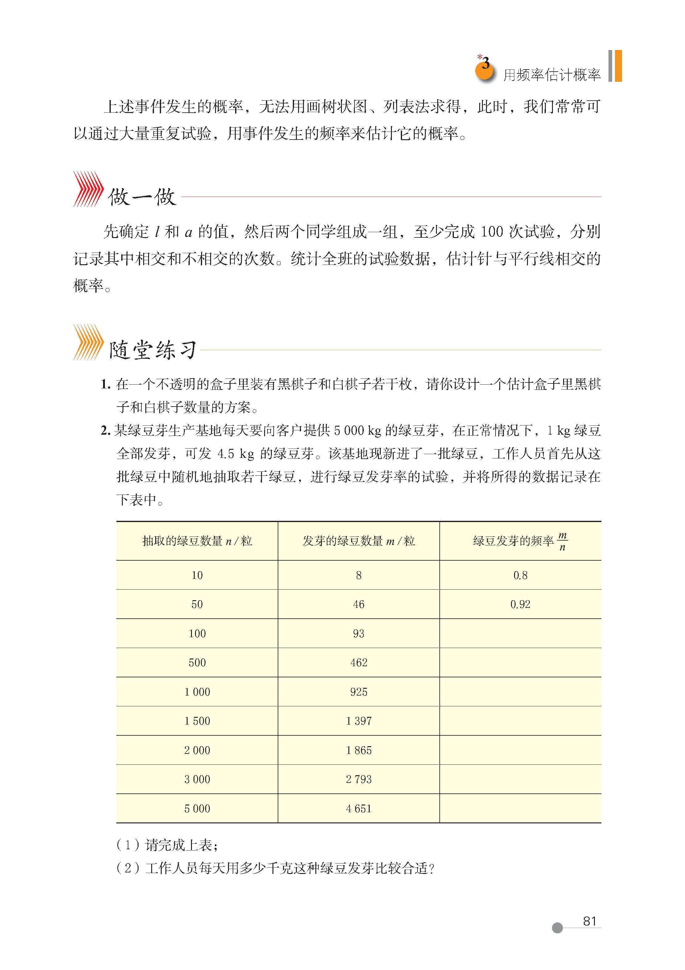 2. “统计活动 —— 视力的变化”:用统计知识解决 “现实问题”该主题要求学生完整经历 “统计探究流程”:设计调查问卷(如 “不同年级学生的用眼时间、视力数据”)→ 收集数据(班级 / 年级抽样)→ 整理数据(绘制条形图 / 折线图 / 扇形图)→ 分析数据(发现 “视力下降与用眼时间的关联”)→ 提出建议(如 “合理安排屏幕使用时间”)。教学意义:衔接八年级 “数据的分析”(平均数、中位数、统计图)和九年级 “用频率估计概率” 的知识,让学生体会 “统计不是简单的画图计算”,而是通过数据收集与分析,发现现实问题(如青少年视力下降趋势)、为解决问题提供依据(如向学校提出 “课间护眼建议”),培养 “数据观念” 和 “社会责任感”。