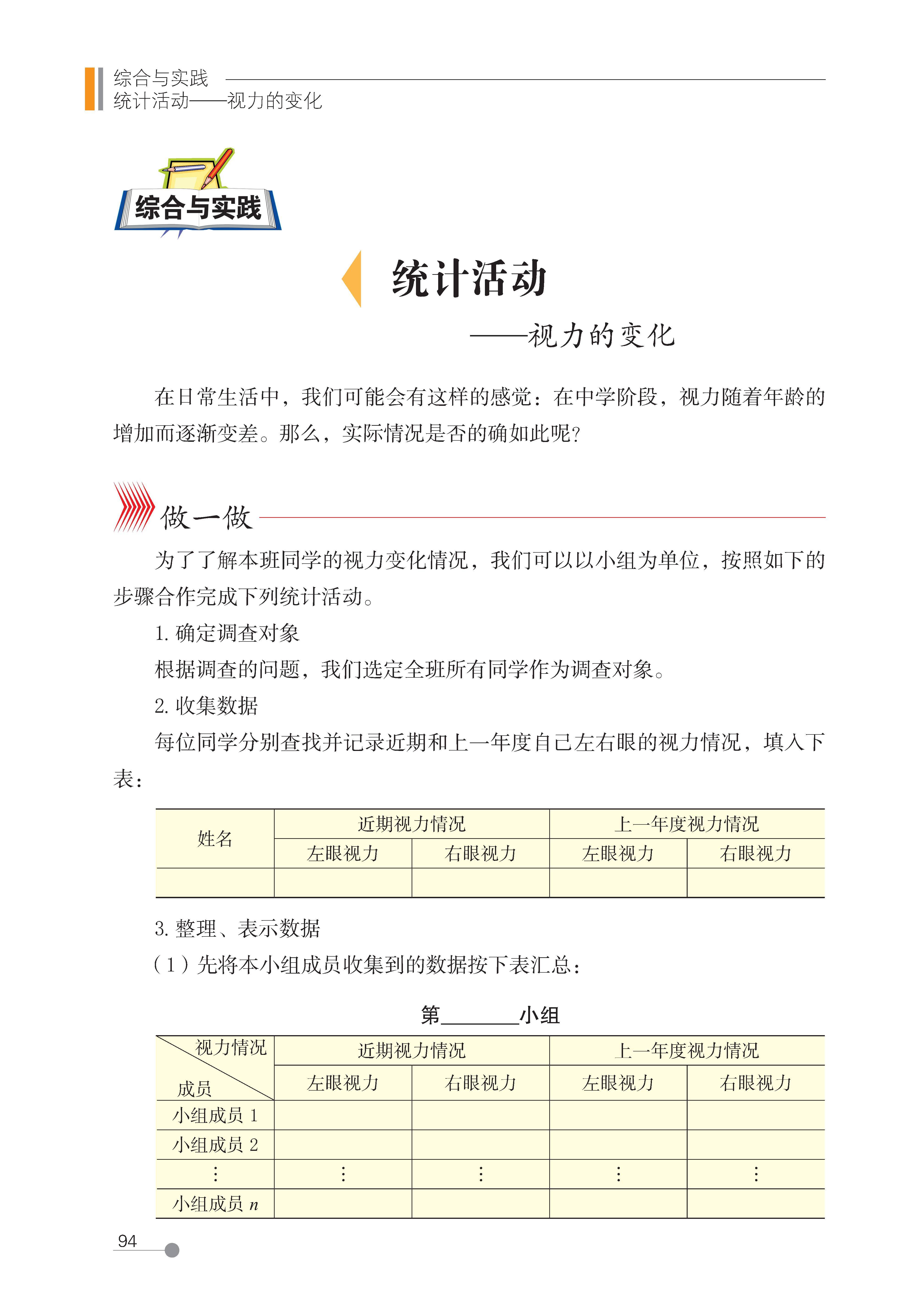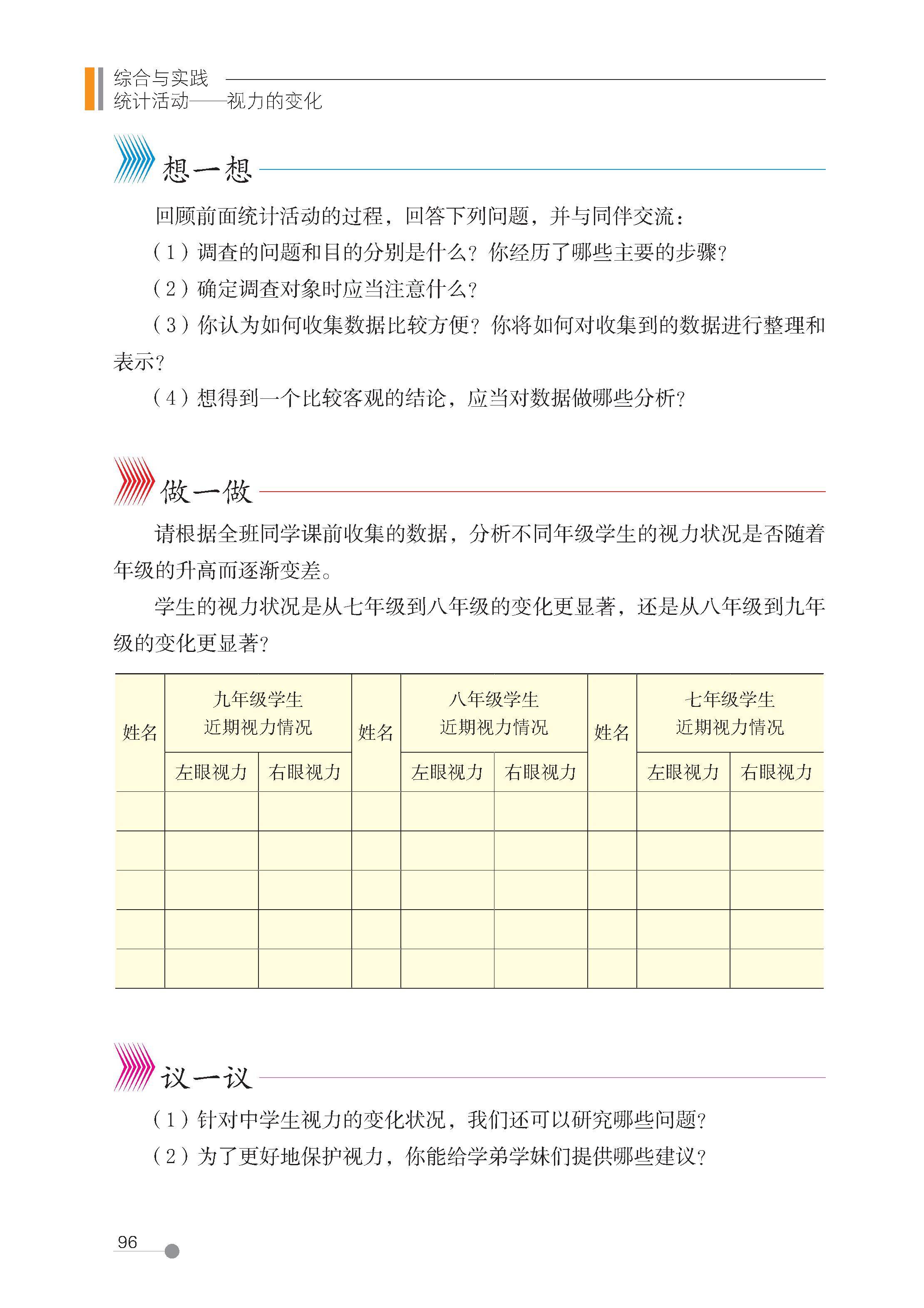 1. 培养 “完整探究能力”:从 “提出问题” 到 “解决问题” 的全流程三个主题均要求学生经历 “明确目标→设计方案→执行操作→分析结果→总结反思” 的完整流程,而非 “被动接受题目条件”。例如 “视力的变化”:学生需自主思考 “要研究‘视力变化’,需要收集哪些数据?”“如何抽样才能保证数据代表性?”“用哪种统计图更能体现变化趋势?”—— 这些问题没有 “标准答案”,需要学生主动探究,培养科学探究的思维习惯。