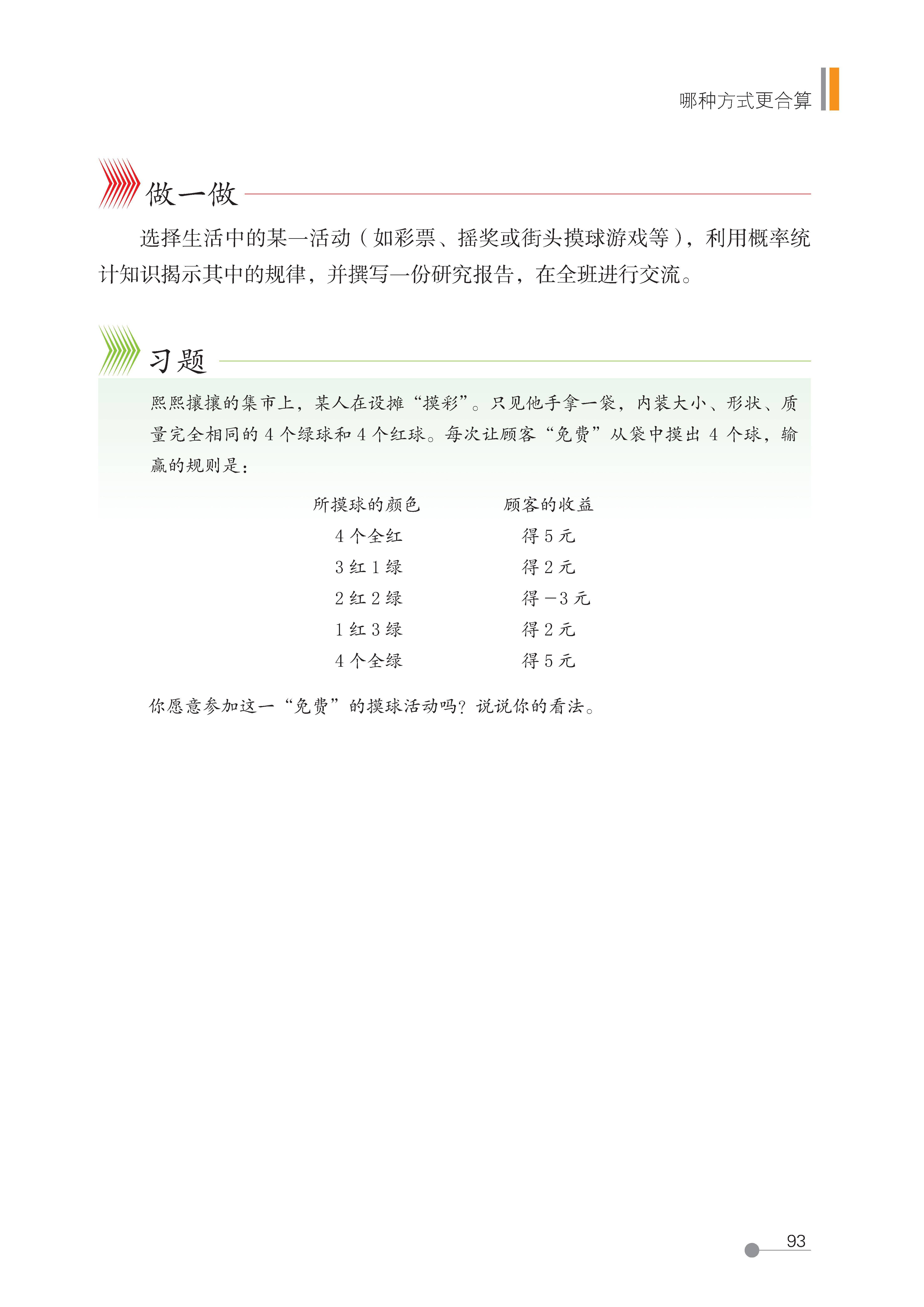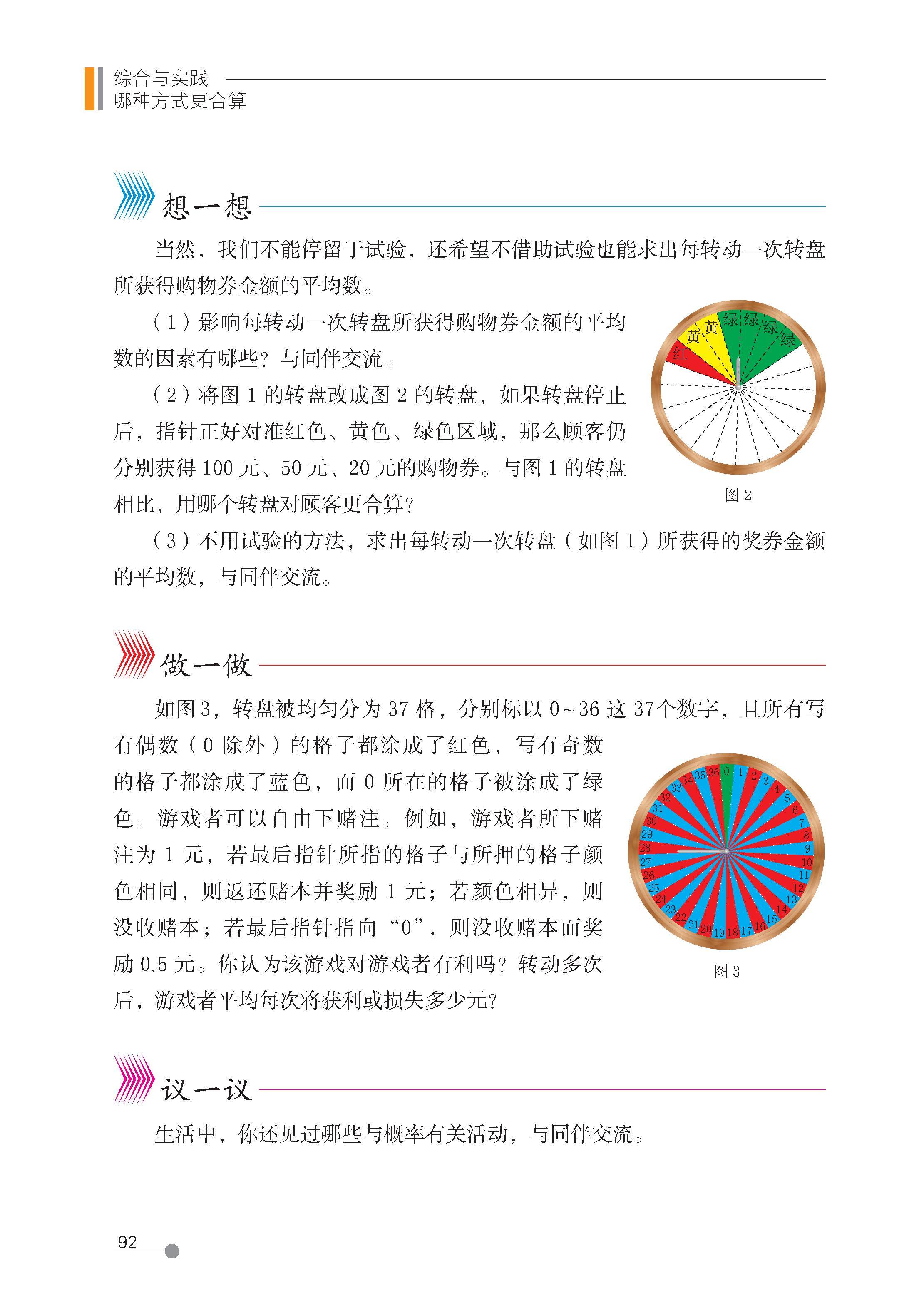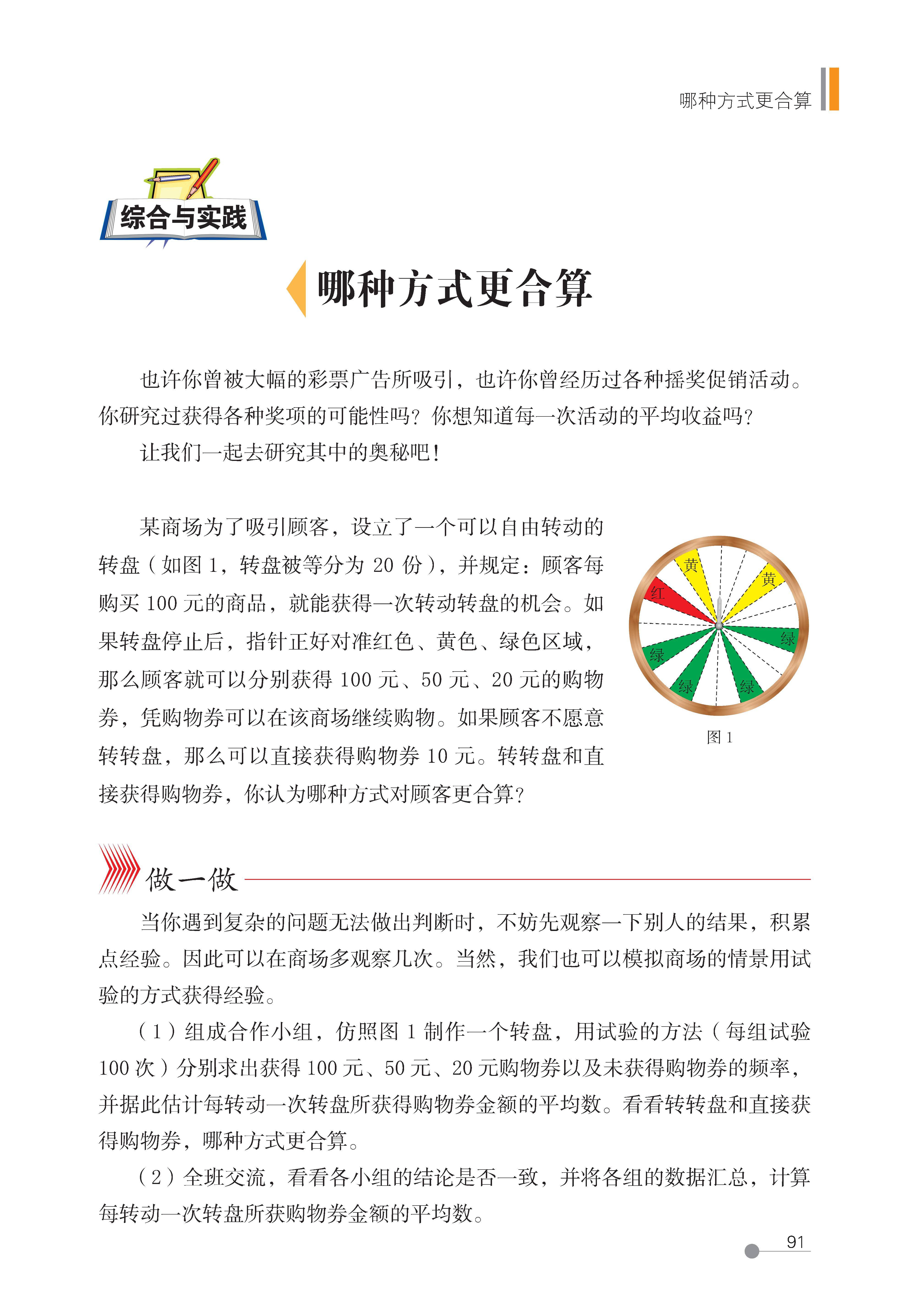 1. “哪种方式更合算”:用概率与代数知识解决 “决策问题”该主题通常围绕 “购物优惠”“抽奖活动”“付费套餐” 等生活场景展开(如 “充话费送礼品” vs “直接打折” 哪种更划算、“抽奖中奖概率” 与 “投入成本” 的权衡)。教学意义:让学生将九年级下册 “概率的进一步认识”(树状图 / 表格求概率)、之前学的 “一元一次方程”“不等式” 等知识结合,通过计算 “期望收益”“成本对比”,理性分析生活中的 “优惠陷阱” 或 “最优选择”,培养用数学思维解决实际决策问题的能力,避免仅凭直觉判断。