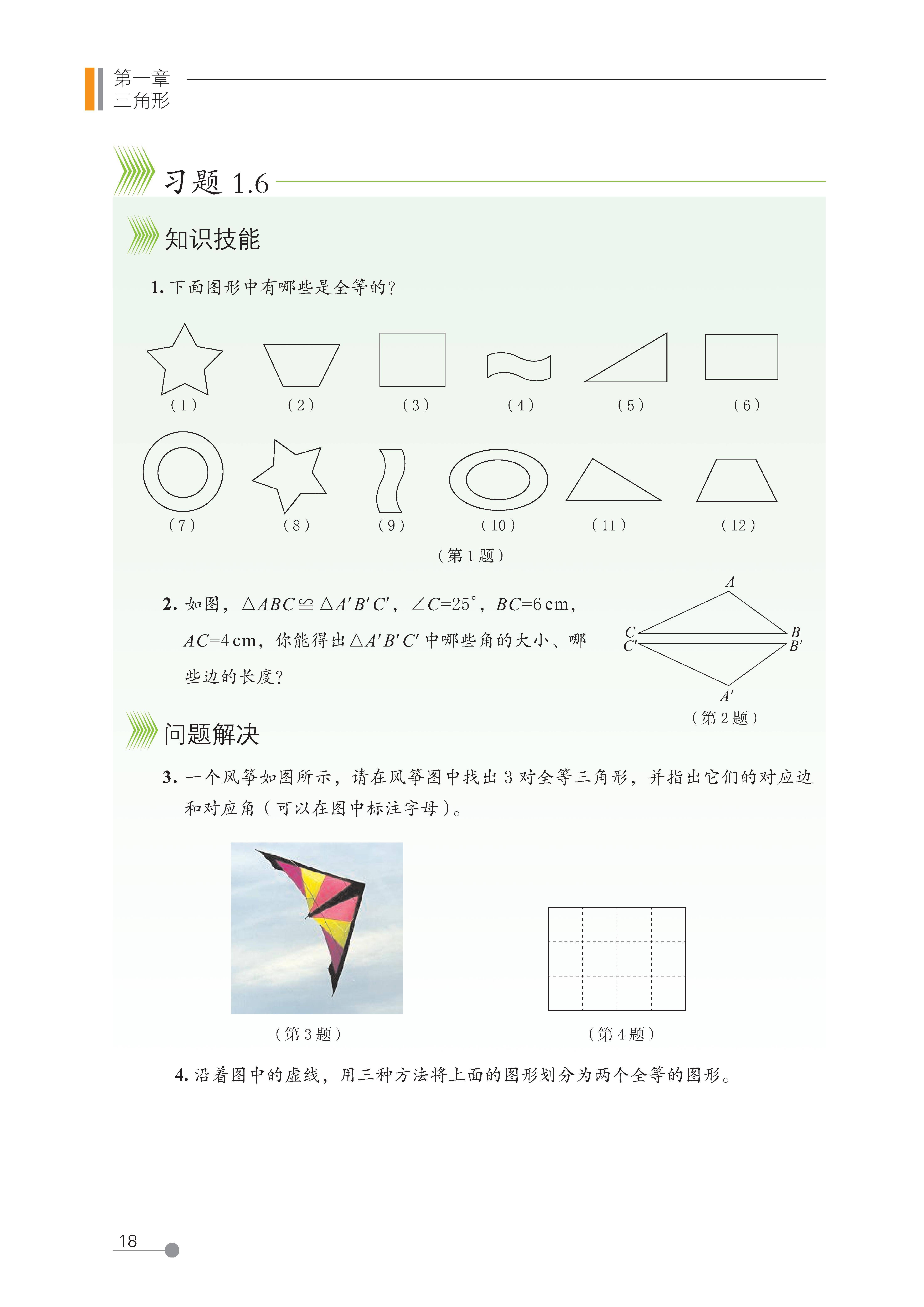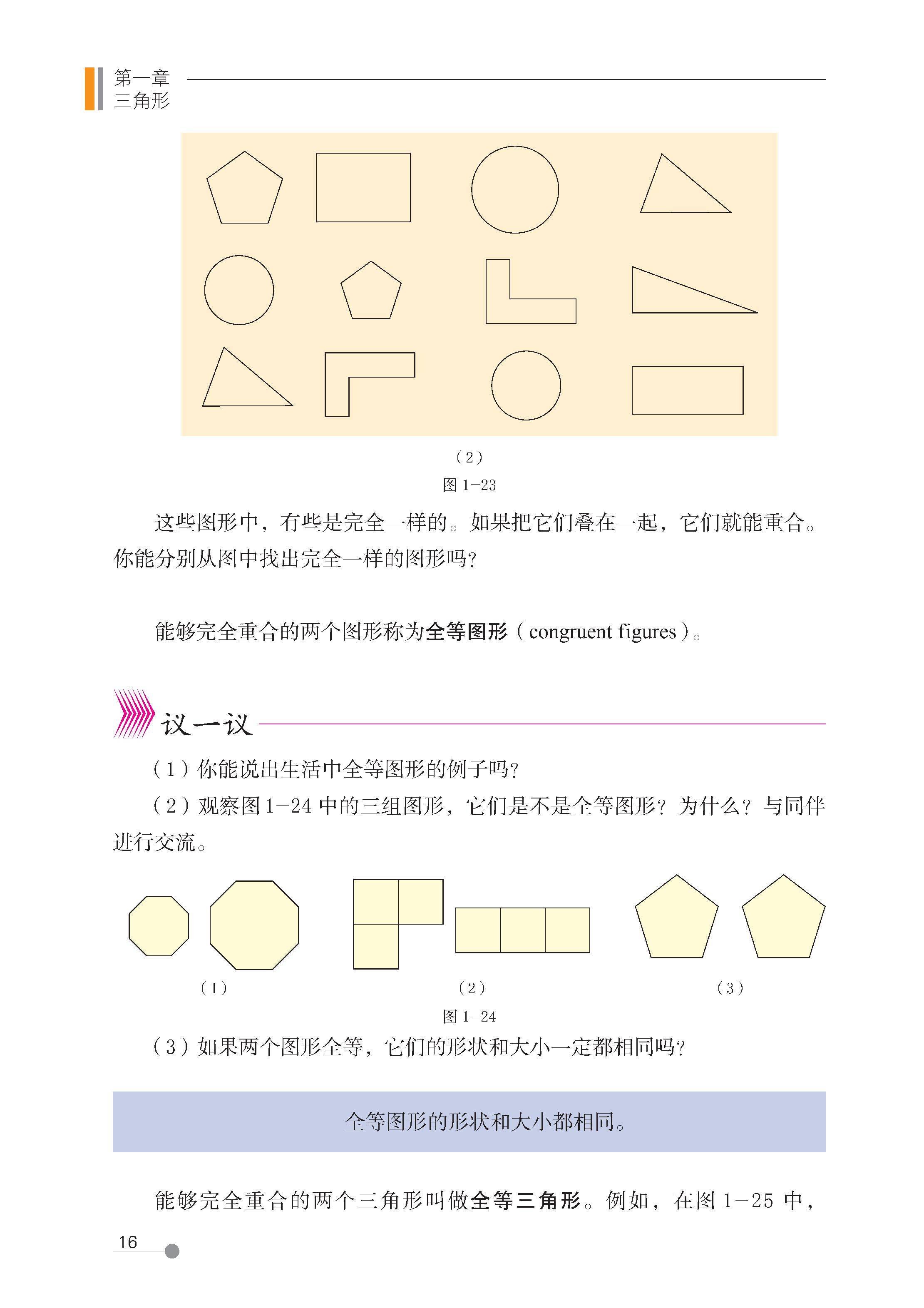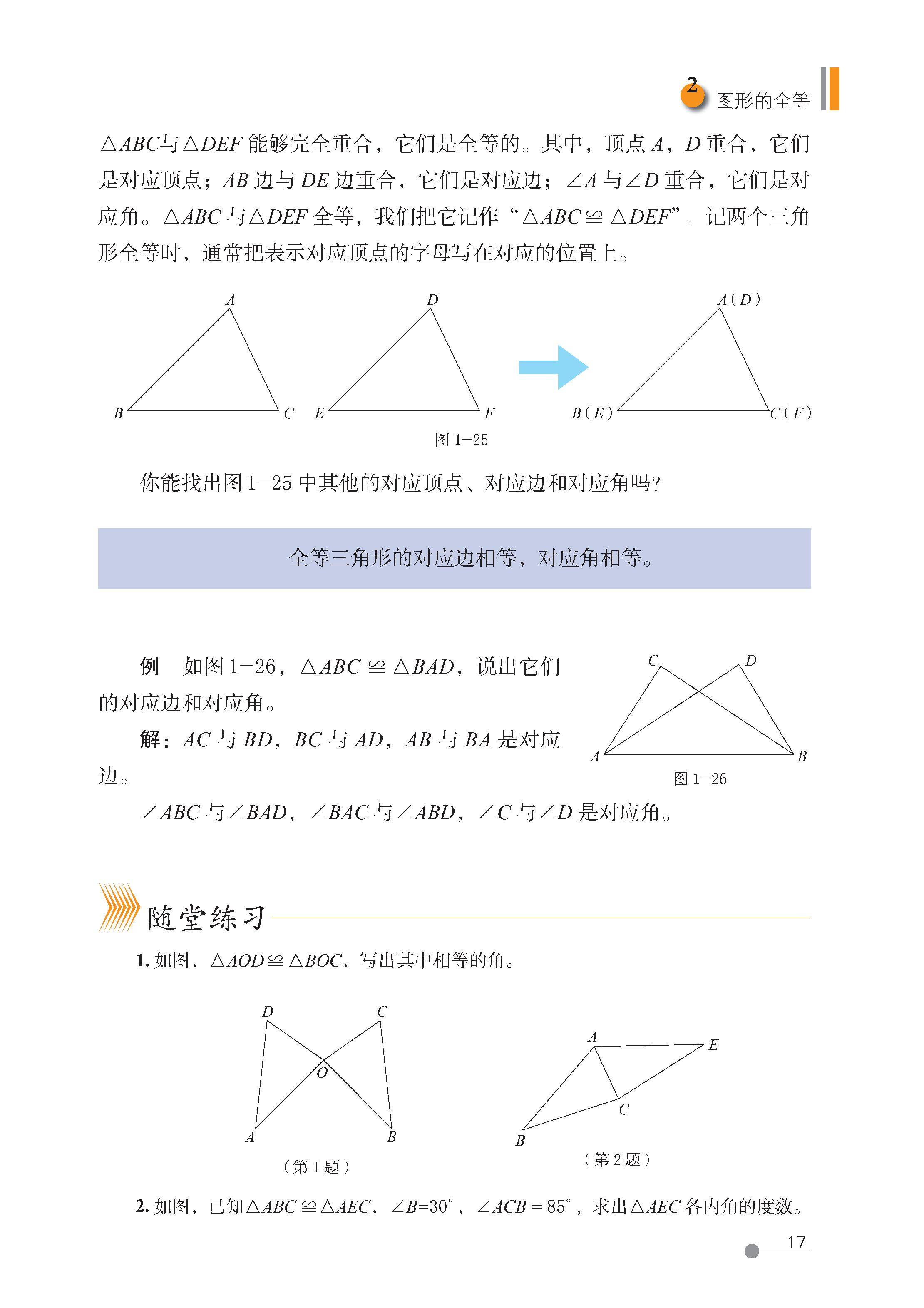 特征:全等图形的对应边相等、对应角相等(后续全等三角形性质的基础)。