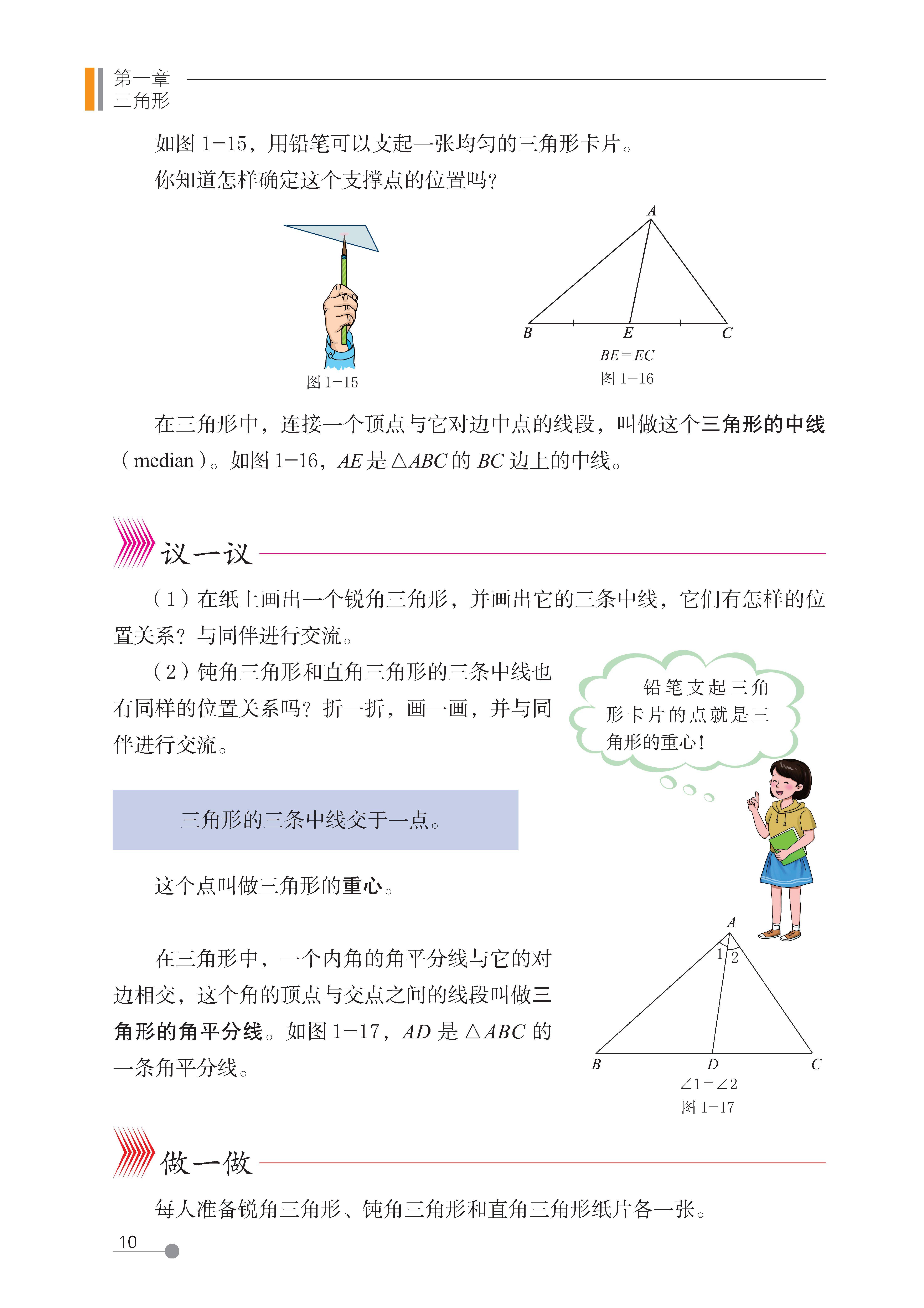 中线 连接三角形一个顶点与对边中点的线段 ① 平分对边(将对边分成两段相等的线段);② 三角形三条中线交于一点(重心,重心到顶点的距离是到对边中点距离的 2 倍);③ 中线将三角形分成面积相等的两个小三角形