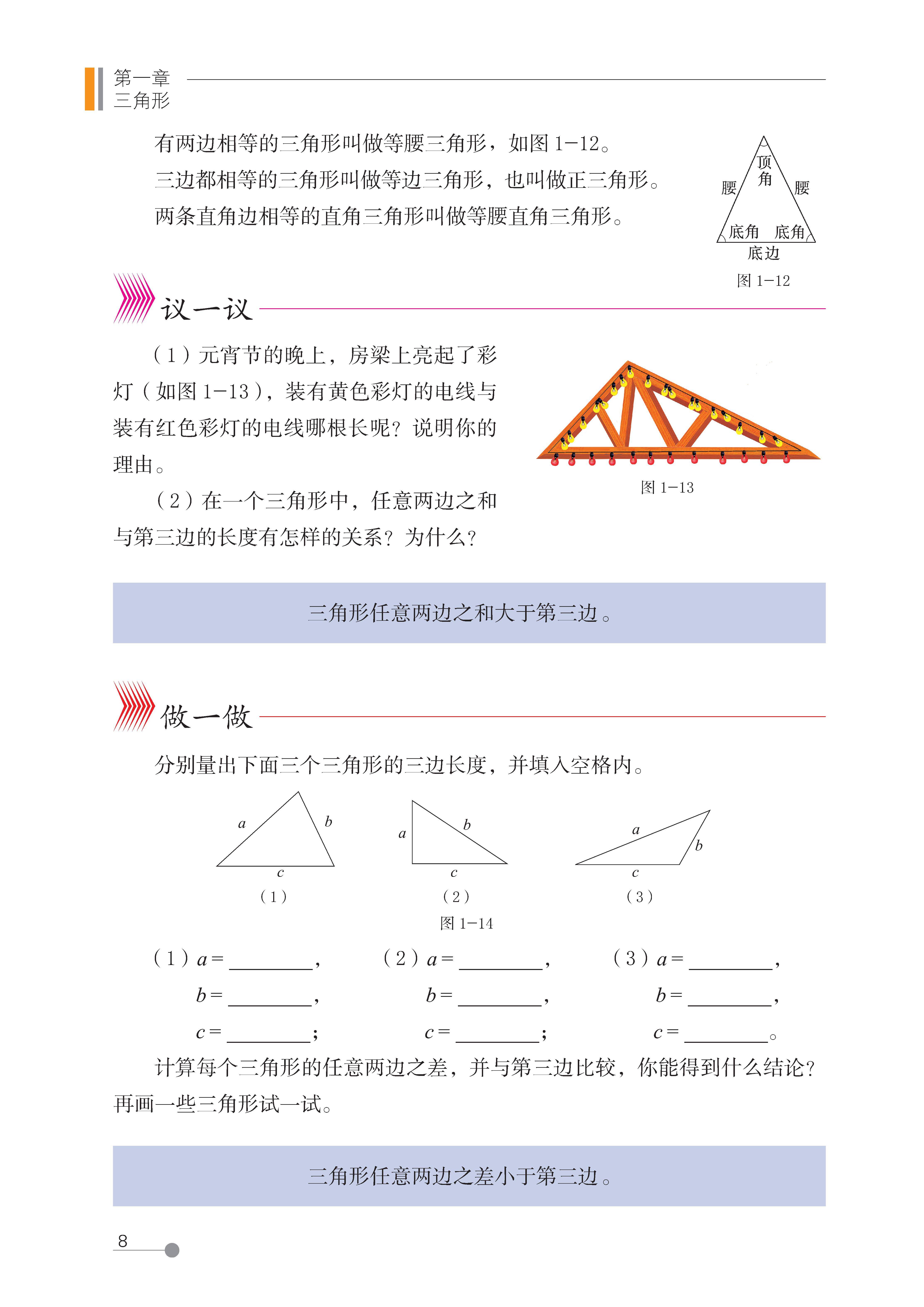 性质 2:三边关系:三角形任意两边之和大于第三边;任意两边之差小于第三边(判断三条线段能否构成三角形的依据)。