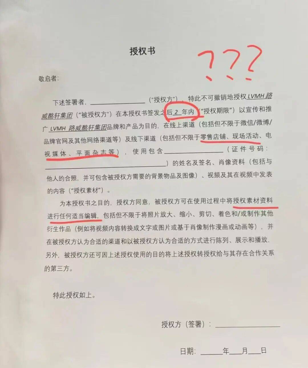 LVMH没有给伴手礼和绿色通道,但是给了一份授权书。授权书征求的是现场学生的姓名及签名、肖像资料为期2年的使用权,LVMH集团可以对授权素材资料进行编辑,并在线上和线下渠道投放。在诺曦看来,这份授权书实在傲慢。
