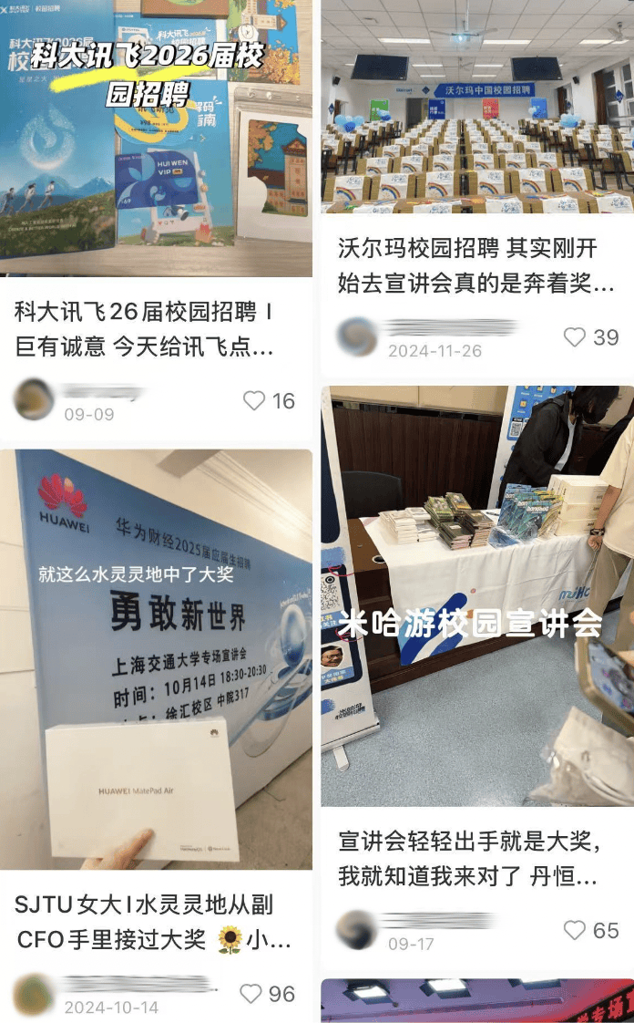 于是相关品牌的宣讲会,即便伴手礼有可能并非人手一份而是先到先得,对于学生来说也是不小的诱惑。