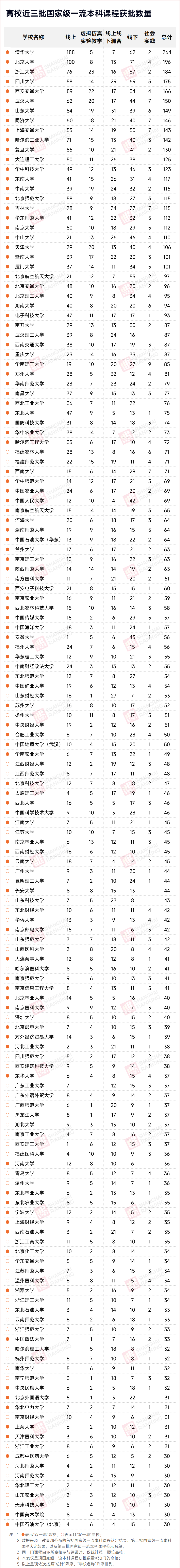 软科统计了高校近三批国家级一流本科课程的获批数量,排在前十的分别是清华大学、北京大学、浙江大学、四川大学、西安交通大学、武汉大学、山东大学、同济大学、上海交通大学、哈尔滨工业大学,彰显了这些“双一流”高校在推动课程提质创优方面的突出成绩。