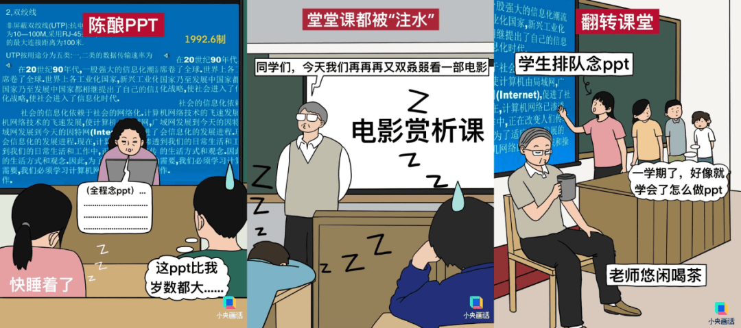 还有一种新型“水课”,打着“翻转课堂”的旗号,上来就让学生做小组汇报,从开学pre到期末。教师在课堂上全程“隐身”,既不教授知识也不给出建议,只剩一群啥也没学过的学生进行“菜鸡互学”。