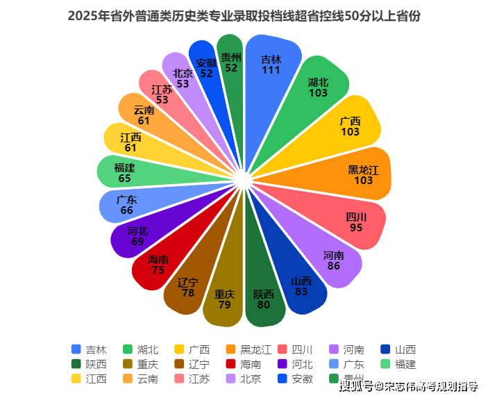 该校在70%以上的外省(市、自治区)投档分高出所在批次省控线50分以上,其中吉林、湖北、广西及黑龙江历史类,广西、黑龙江、河南及贵州物理类投档分均超出所在省份投档分100分。外省录取投档分超省控线50分以上的具体情况如上图所示。