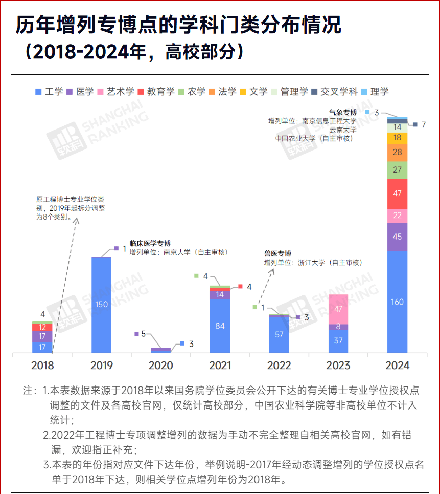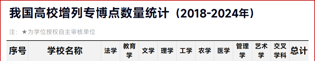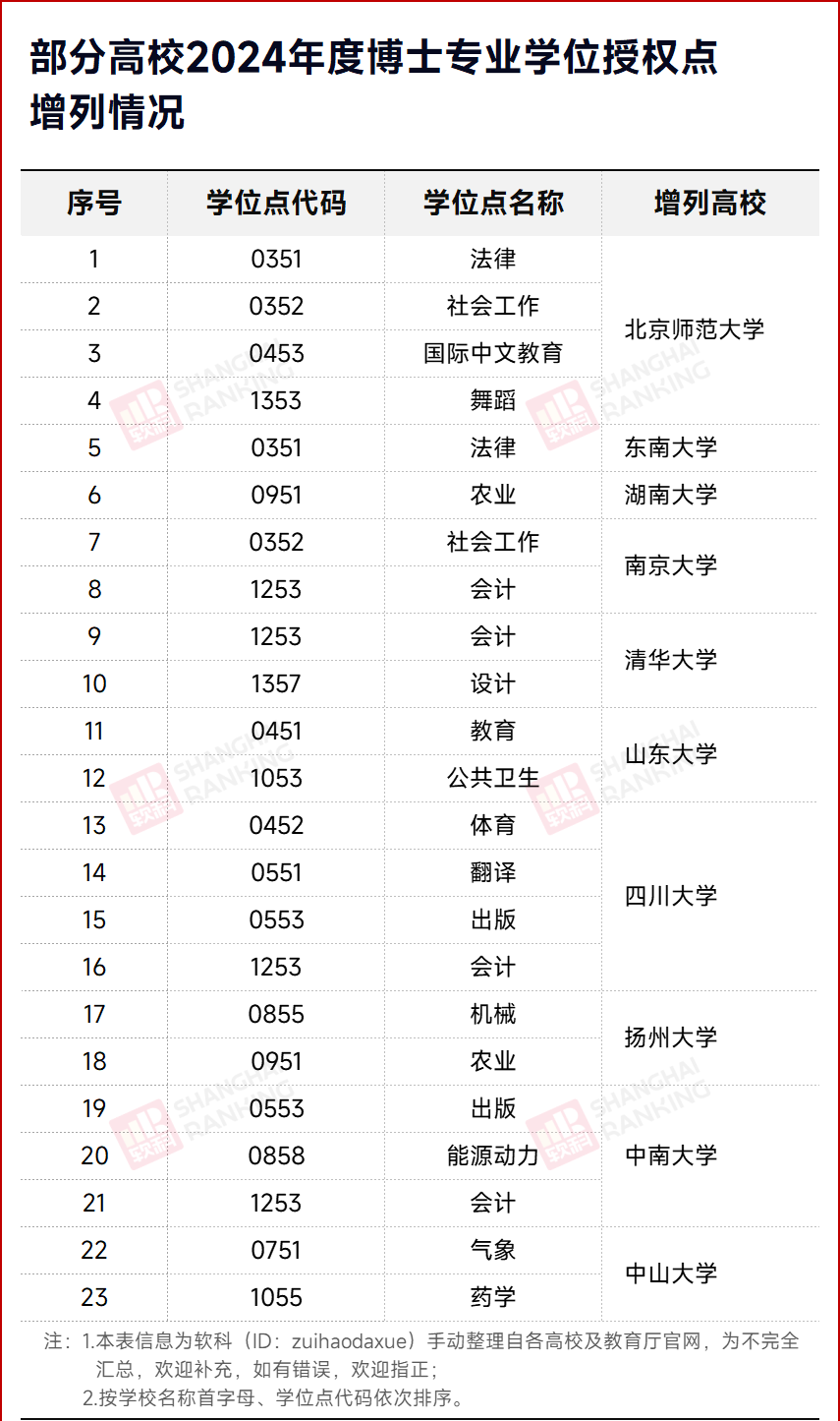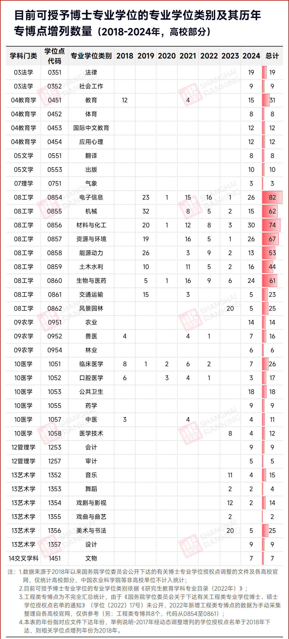 2024年,增列专博点第一次覆盖了所有可授予博士专业学位的学科门类,法学、文学、理学、管理学、交叉学科(新增门类)5个此前未有过博士专业学位类别的学科门类,法律、翻译、气象、会计等16个学位类别迎来了第一批专博点。