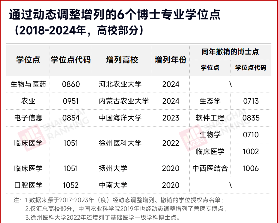 从新增途径来看,从2018-2024年,我国高校主要通过新增学位授权审核(三年一度)增列专博点,其中又以2024年(占比68.3%)为主,除工程专博调整的特殊情况外,自主审核高校新增专博点数量亦较多。值得一提的是,7年间高校通过动态调整方式新增的专博点只有6个,仅占不到1%,这6个专博点分别来自河北农业大学、内蒙古农业大学、中国海洋大学、徐州医科大学、扬州大学、中南大学。根据《博士、硕士学位授权学科和专业学位授权类别动态调整办法》,动态调整新增专博点一般要求撤销其他专博点、一级学科博士点(也即“以一换一”),或由省级学位委员在数量限额内统筹。