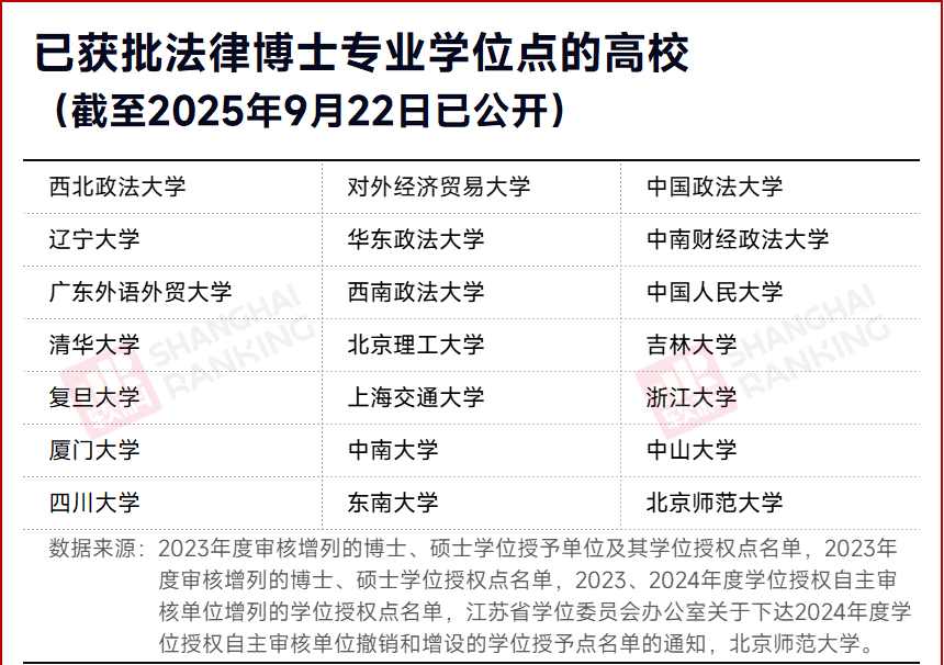今年9月,中国人民大学、中国政法大学、西南政法大学、厦门大学、辽宁大学等高校举行首届法律博士开学仪式。此前,人大等19所高校获批我国首批法律博士专业学位点(后文简称“专博点”),从这些学校中,也将诞生我国首批法律专业学位博士(后文简称“专博”)。近日,国务院学位委员会公布2024年度学位授权自主审核单位/动态调整撤销和增设的学位授予点名单,已公开结果的高校中,东南大学、北京师范大学也获批法律专博点。