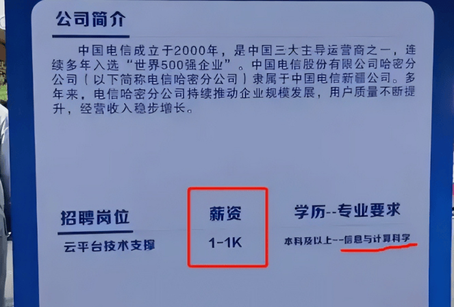 有同学发文称,之前自己参加了西安某校校招的同学“惊喜的”发现,招聘会上有一家来自新疆哈密的公司给信息与计算科学专业的学生的学生开出了1-1K的工资。