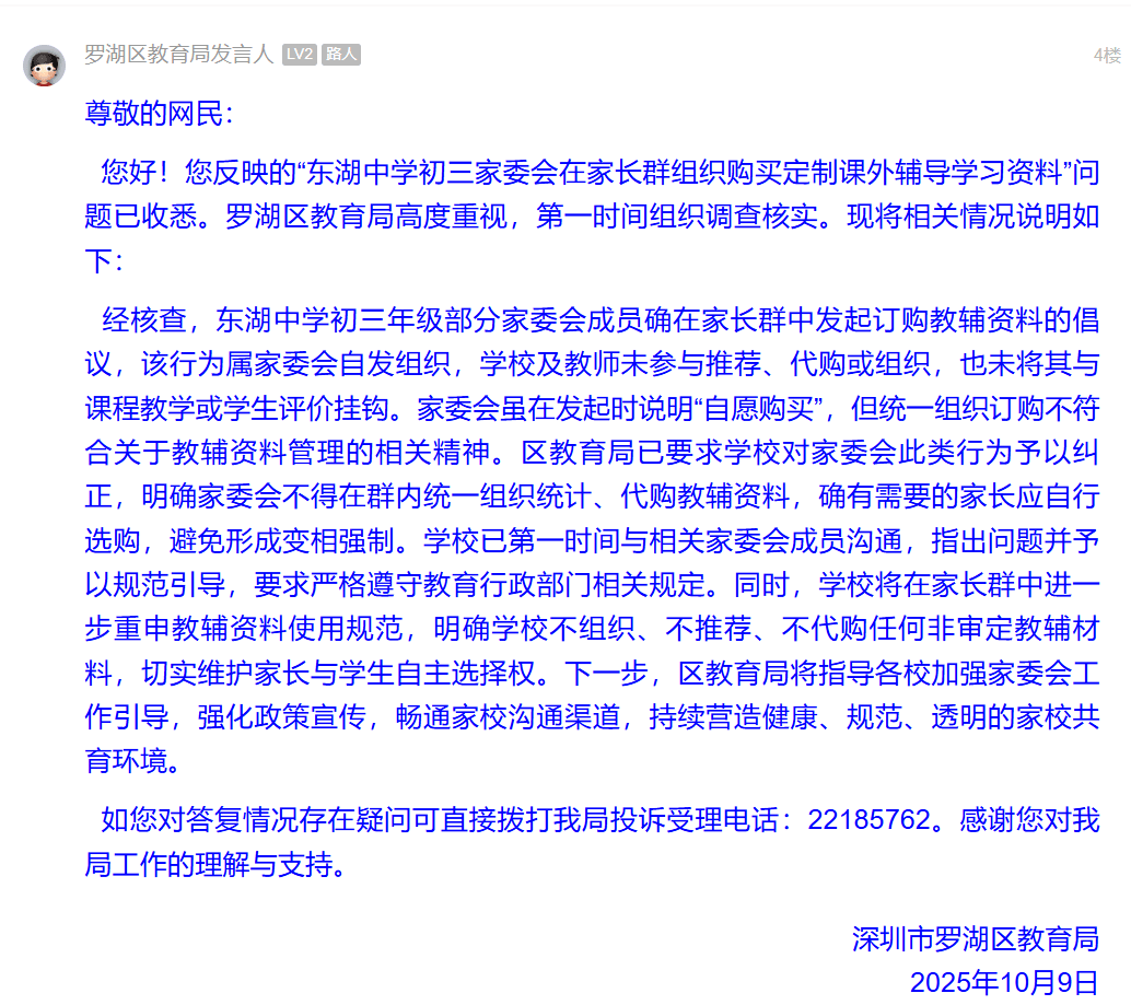 学校已第一时间与相关家委会成员沟通,指出问题并予以规范引导,要求严格遵守教育行政部门相关规定。同时,学校将在家长群中进一步重申教辅资料使用规范,明确学校不组织、不推荐、不代购任何非审定教辅材料,切实维护家长与学生自主选择权。
