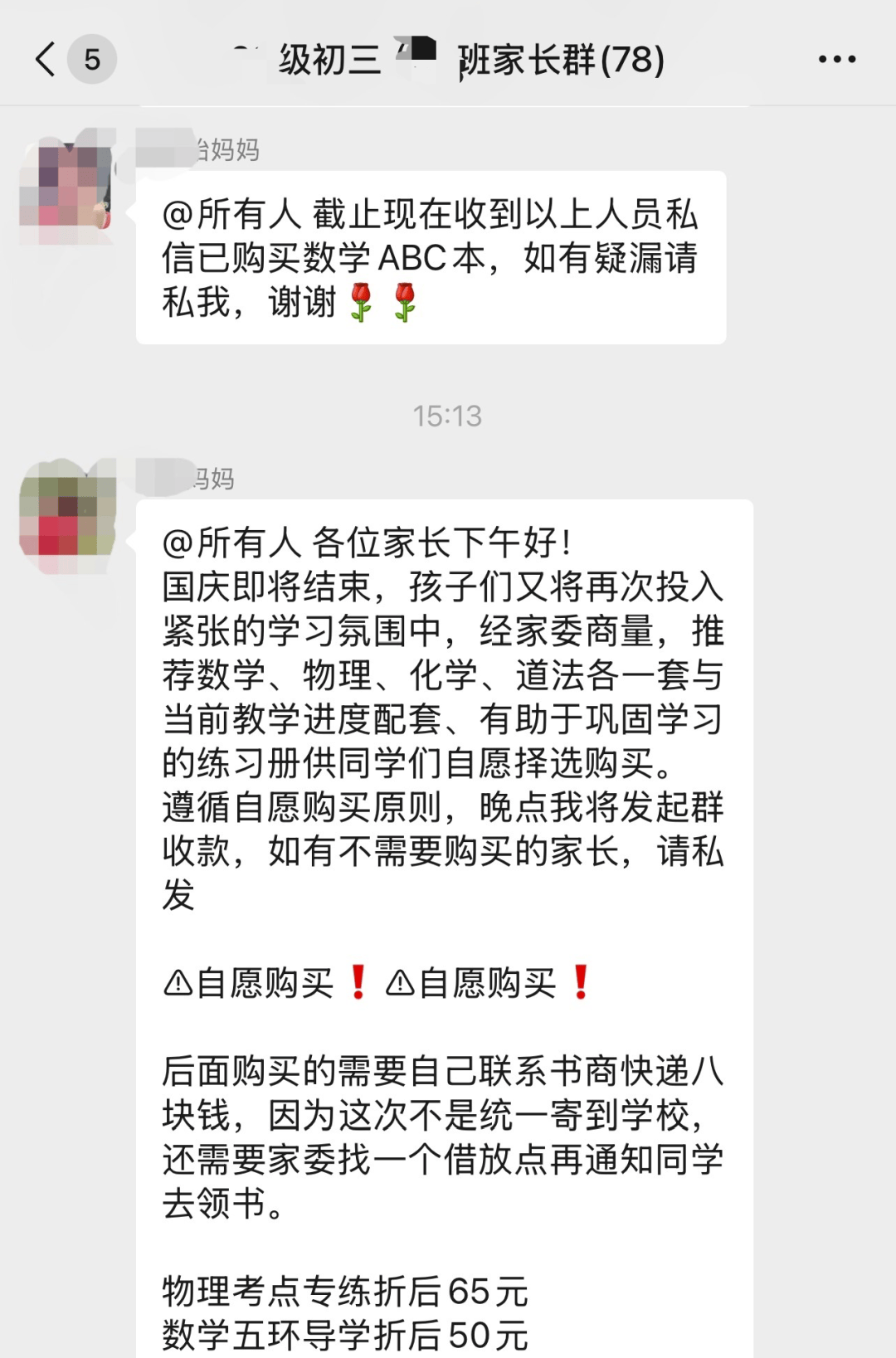 据该家长描述,家委会虽称此举是“经与老师及家长商议后自愿购买”,但实际上带有一定的强制倾向,或有“道德绑架”之嫌。该家长进一步表示,初三学生课业压力已较大,不提倡再增加课外负担。此外,家委会近期还计划组织军训并另行收费,让部分家长感到经济压力。
