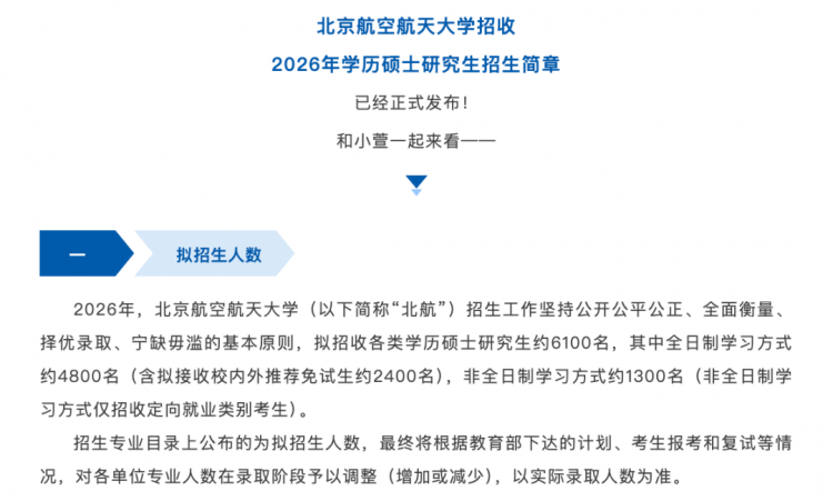 2026年,北京航空航天大学招生工作坚持公开公平公正、全面衡量、择优录取、宁缺毋滥的基本原则,拟招收各类学历硕士研究生约6100名,其中全日制学习方式约4800名(含拟接收校内外推荐免试生约2400名),非全日制学习方式约1300名(非全日制学习方式仅招收定向就业类别考生)。