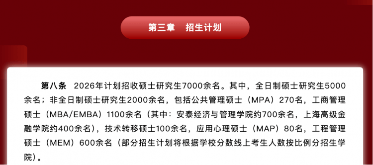 2026年计划招收硕士研究生7000余名。其中,全日制硕士研究生5000余名;非全日制硕士研究生2000余名,包括公共管理硕士(MPA)270名,工商管理硕士(MBA/EMBA)1100余名(其中:安泰经济与管理学院约700余名,上海高级金融学院约400余名),技术转移硕士100余名,应用心理硕士(MAP)80名,工程管理硕士(MEM)600余名(部分招生计划将根据学校分数线上考生人数按比例分招生学院)。