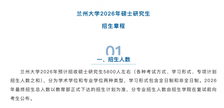 兰州大学2026年预计招收硕士研究生5800人左右(各种考试方式、学习形式、专项计划招生人数之和),分为学术学位和专业学位两种类型,学习形式包含全日制和非全日制。2026年最终招生总人数以教育部正式下达的招生计划为准,分专业招生人数由招生学院在复试前向考生公布。