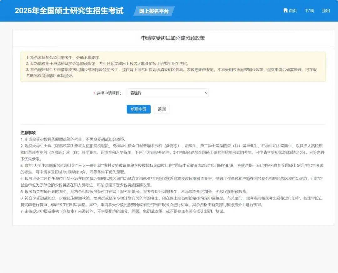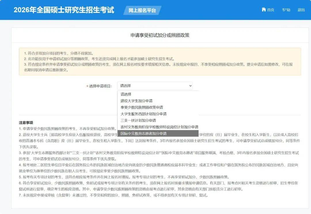 根据教育部印发《2026年全国硕士研究生招生工作管理规定》的要求,符合申请享受考研初试加分政策的国际中文教育志愿者,须在“”报名时按要求填报相关信息,由有关部门按职责分工进行审核。未按规定申报或审核(含复审)未通过的,不享受相关加分政策。