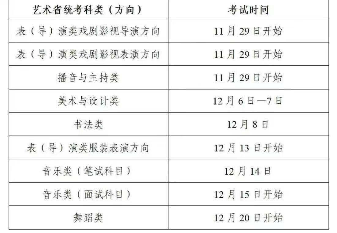 考生须选择相应的省统考科类(方向)(可多选),并同时填选相关信息,完成省统考报考手续。平行志愿批次录取志愿填报时,各科类志愿不能同时兼报,考生只能选择一个科类填报,同一科类内不同方向可兼报。美术与设计类省统考考生在高考报名地所属的设区市参加专业考试。音乐、舞蹈、表(导)演、播音与主持、书法等5类省统考,专业考试在指定考点集中进行。各科类省统考时间如下: