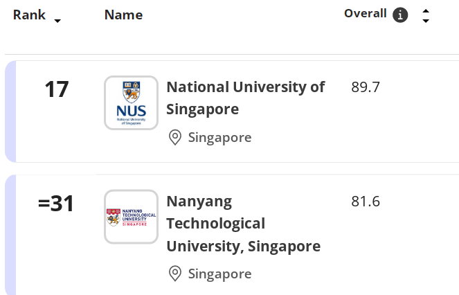 新加坡国立守17,连续3年未动,与清北一样进入“高位平台期”,南洋理工大学第31名。