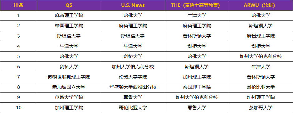 2026四大榜单中均位列Top10的院校有:MIT、哈佛、斯坦福、牛津、剑桥看来无论排名指标如何变化,这几所学校凭借着硬实力,受到了一致认可。