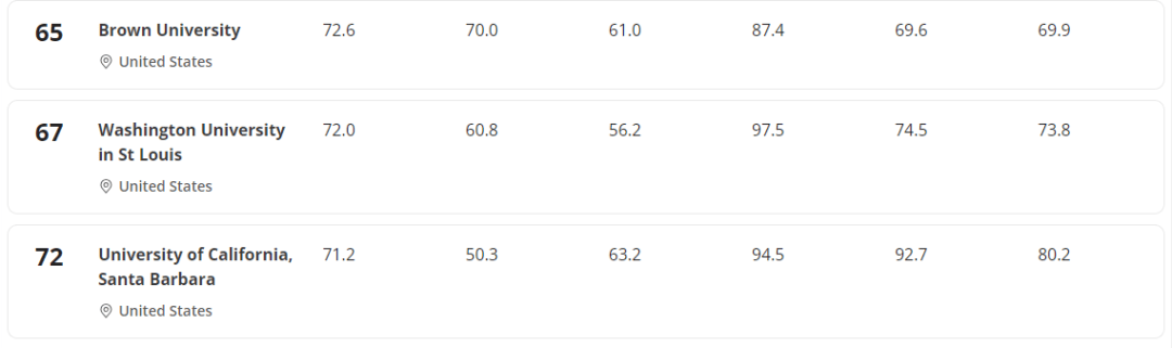• 布朗大学去年短暂从第64名进步到了第58名,今年又跌回了第65名;