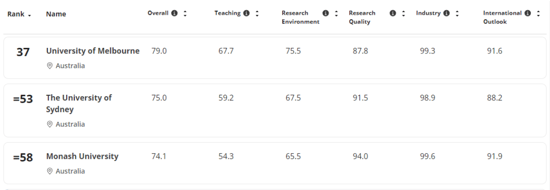 ▪️ 墨尔本大学上升2位,位居全球37,稳居澳洲榜首;