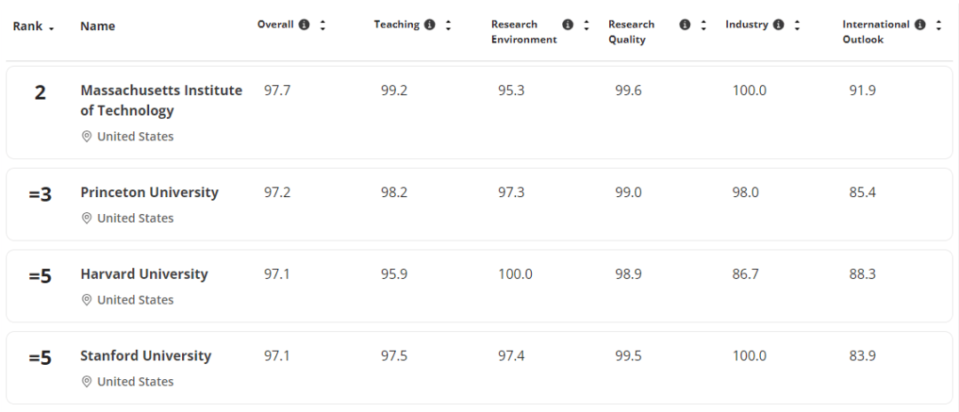 可以看出,在排名前十中,美英高校仍然占据主导地位,其中有7所美国大学和3所英国大学。