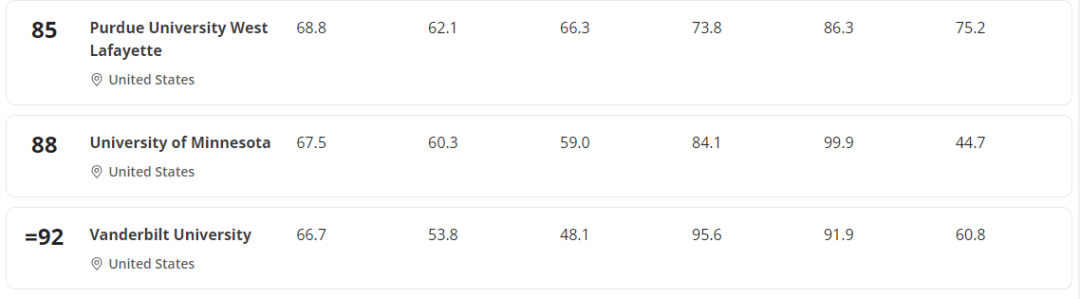 • 普渡大学西拉法叶校区下降6名,位列第85名;