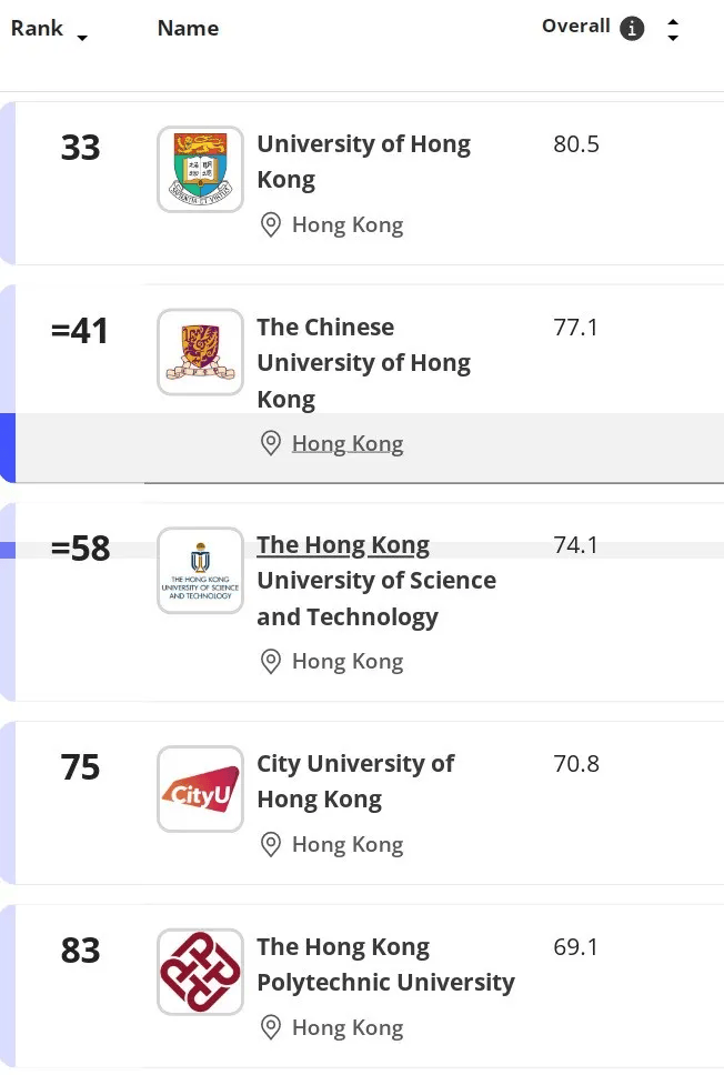 其余所高校的排名跃升,更具含金量。如:香港大学稳居香港院校之首,位列全球第33位,较去年上升2位香港中文大学位列第41名,较去年上升3位;香港科技大学上升8位至第58名;香港城市大学和香港理工大学分别位列第75位和第83位。