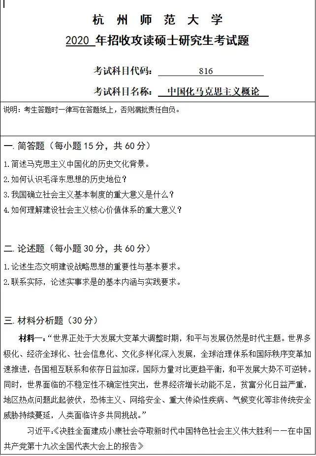 2006-2020年杭州师范大学813中国化马克思主义概论考研真题试卷