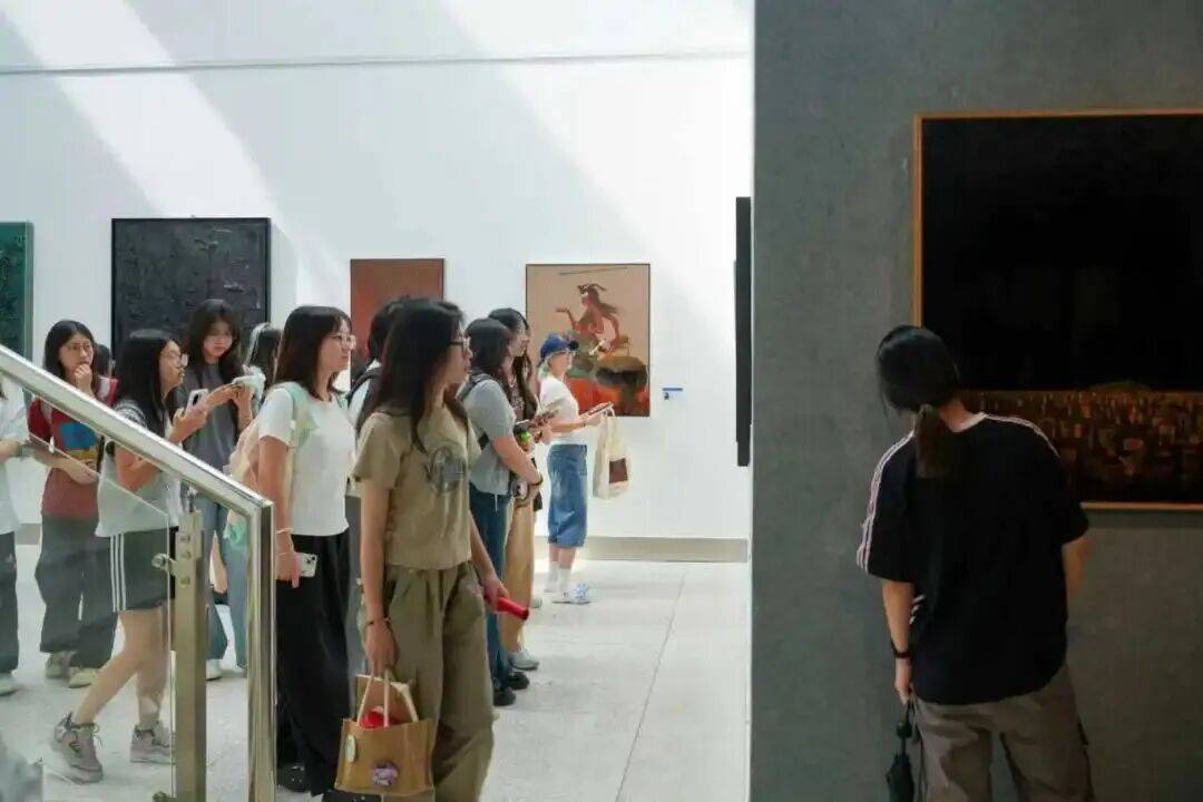 观展中,新生在专业教师与参展艺术家们的向导下,沉浸式感受传统水墨与现代艺术的碰撞:一侧是笔墨雅致的中国画,勾勒出江南烟雨与家国山河的韵味;另一侧是色彩浓烈的油画与肌理独特的漆画,展现出青年艺术家对当代生活的观察与表达。观展学生纷纷感慨,这些作品让他们看到了青春力量与文化传承的碰撞。