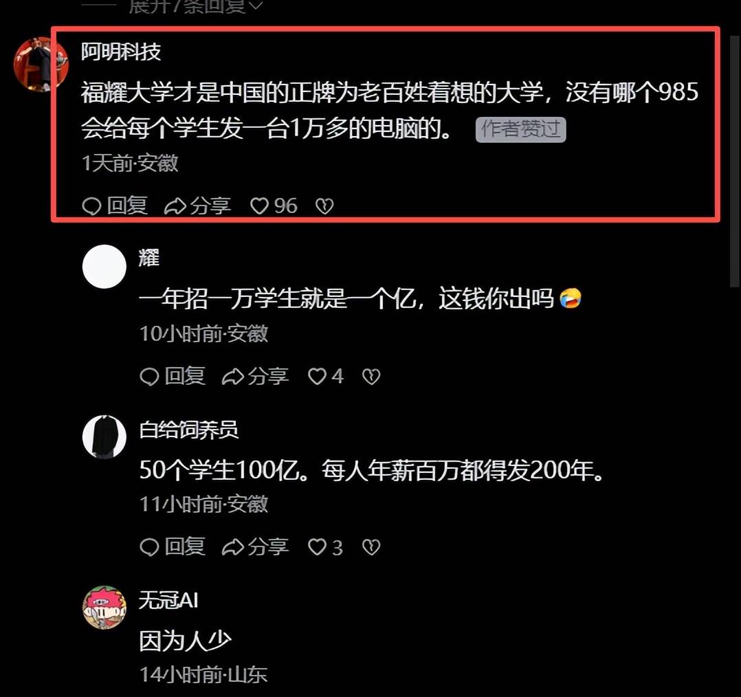 对此事情,竟然有网友发出了比较低智的评论,这个网友说:福耀大学才是中国的正牌为老百姓着想的大学,没有哪个985会给每个学生发一台1万多的电脑的。