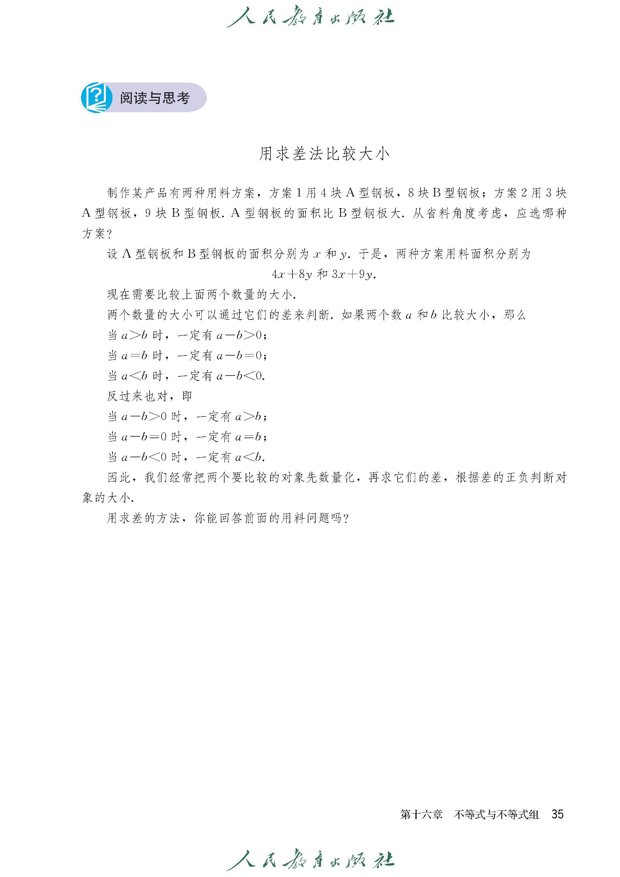 阅读与思考 用求差法比较大小
