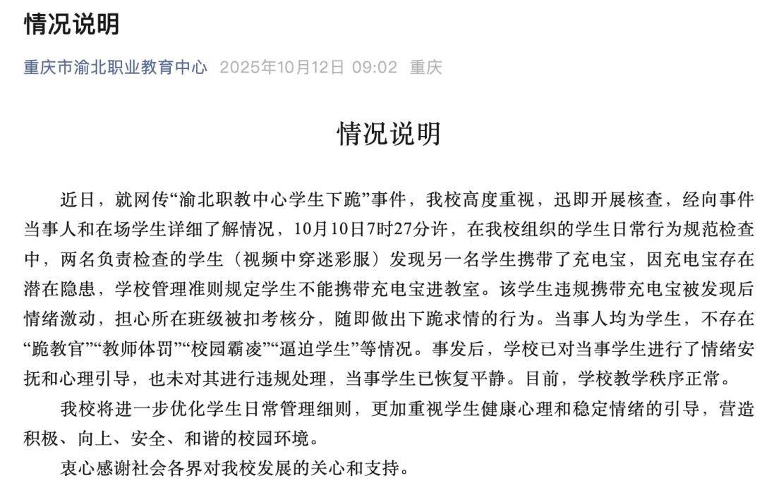 10月10日,重庆某职教中心,一次再普通不过的行为规范检查。两名学生干部(穿迷彩服者)发现一名同学携带了违规的充电宝。规定本身是为了安全,合情合理。