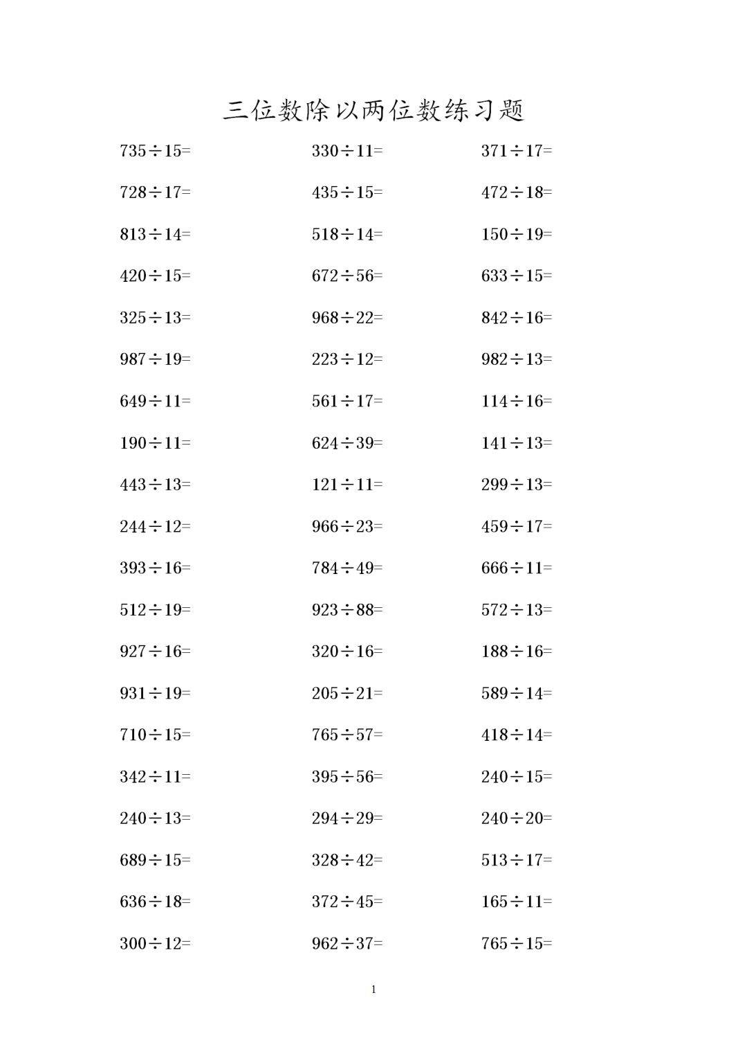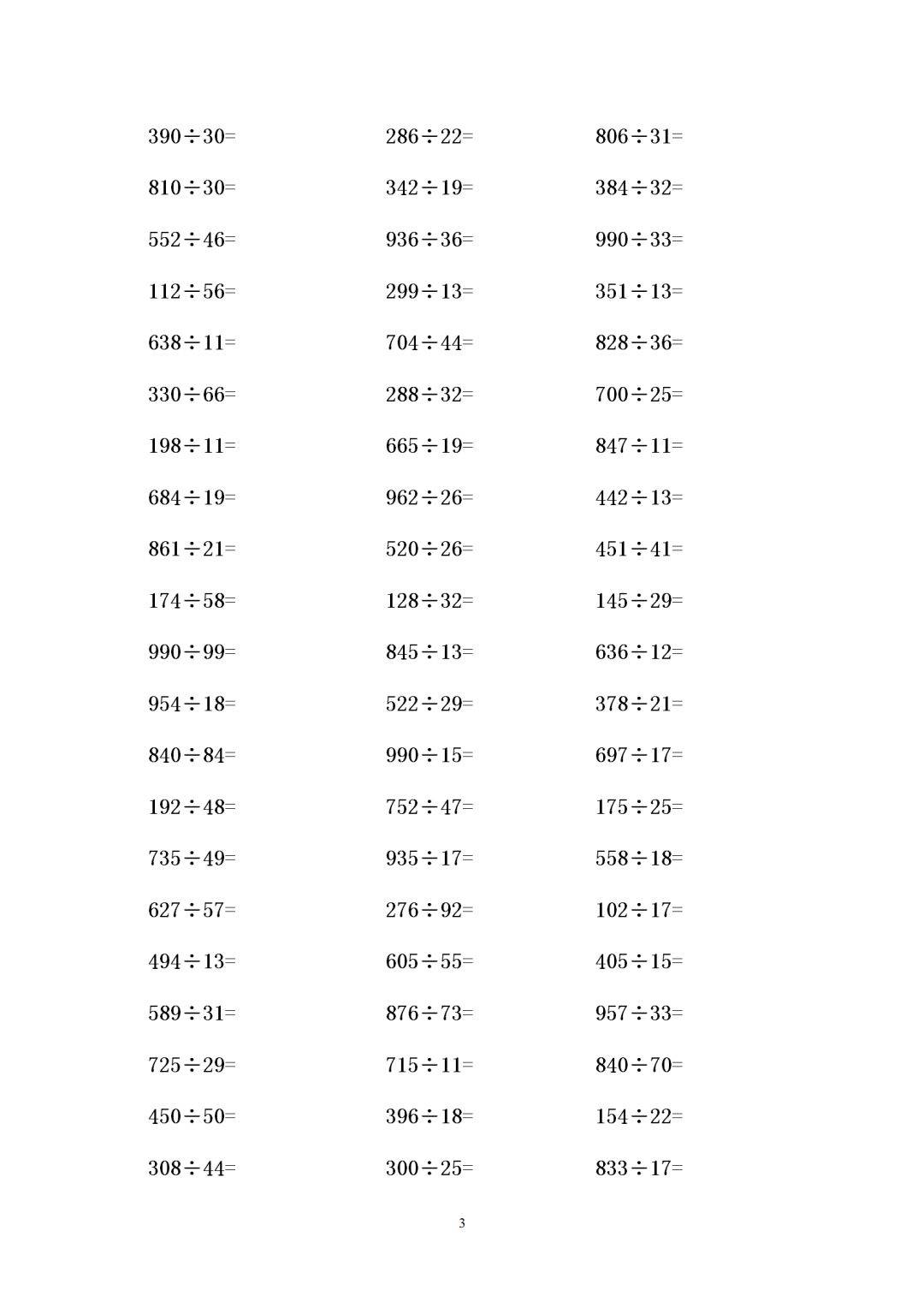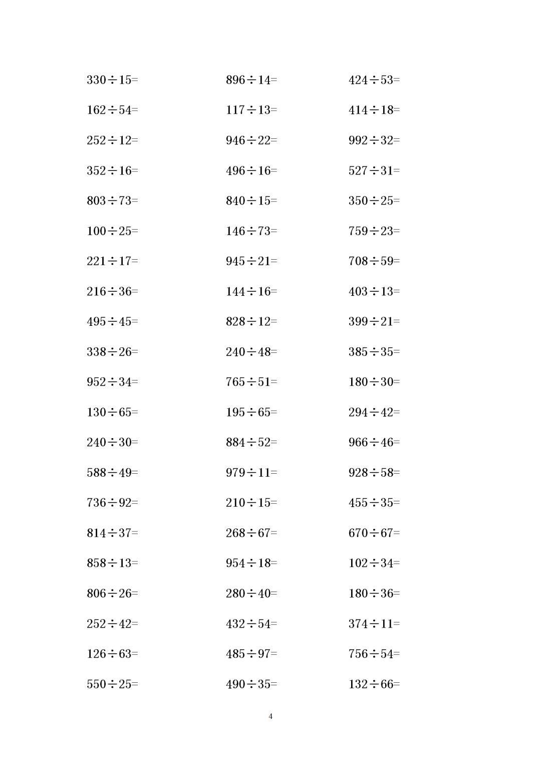 四年级数学三位数除以两位数有余数除法练习题300道
