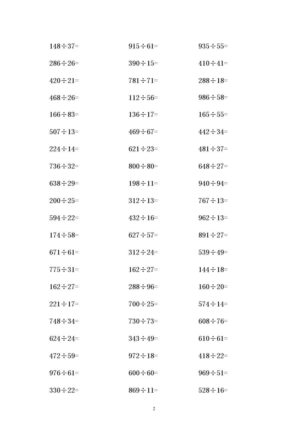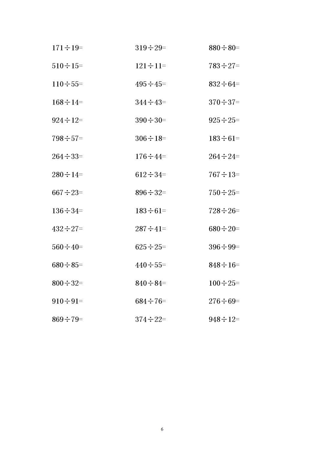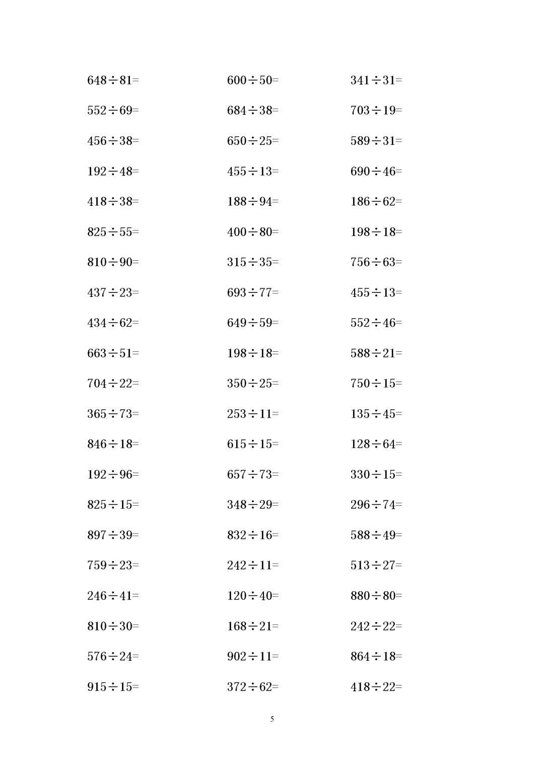 四年级数学三位数除以两位数有余数除法练习题300道